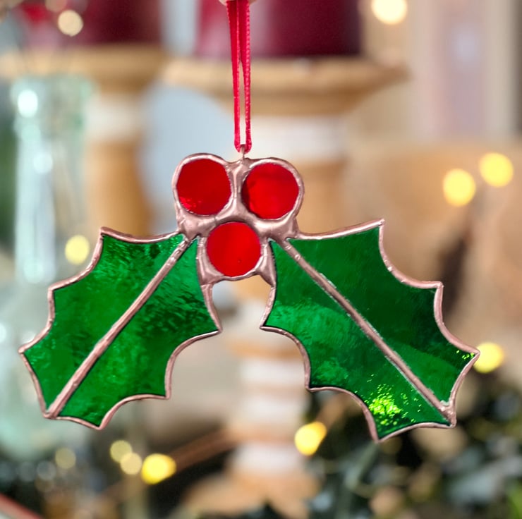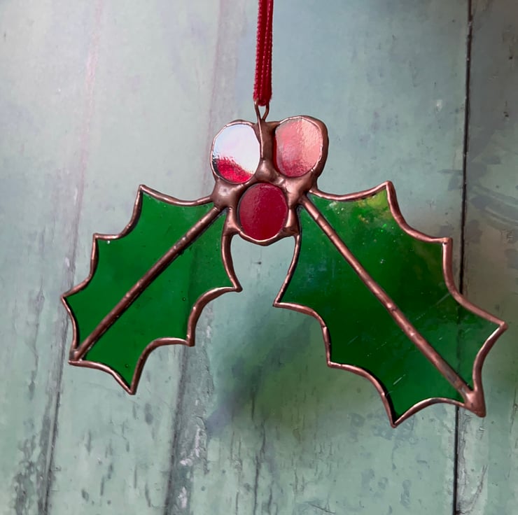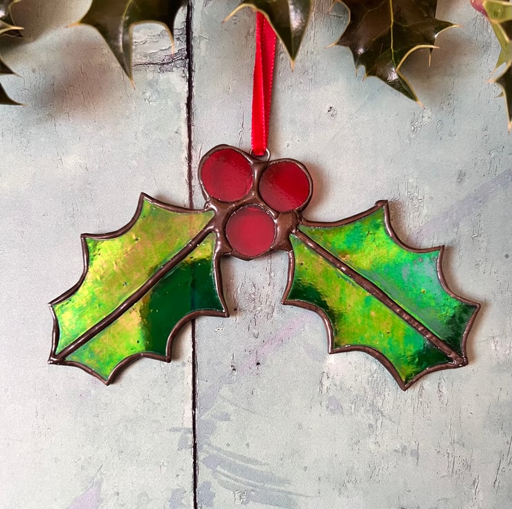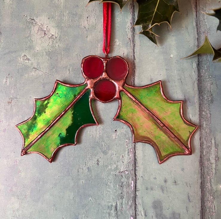 Stunning iridescent green stained glass holly and berries Christmas decoration with vibrant red berries. There is an option of black or copper patina to personalise your choice. Rich and luxurious, these are stunning gifts but you might just love them too much to give away!