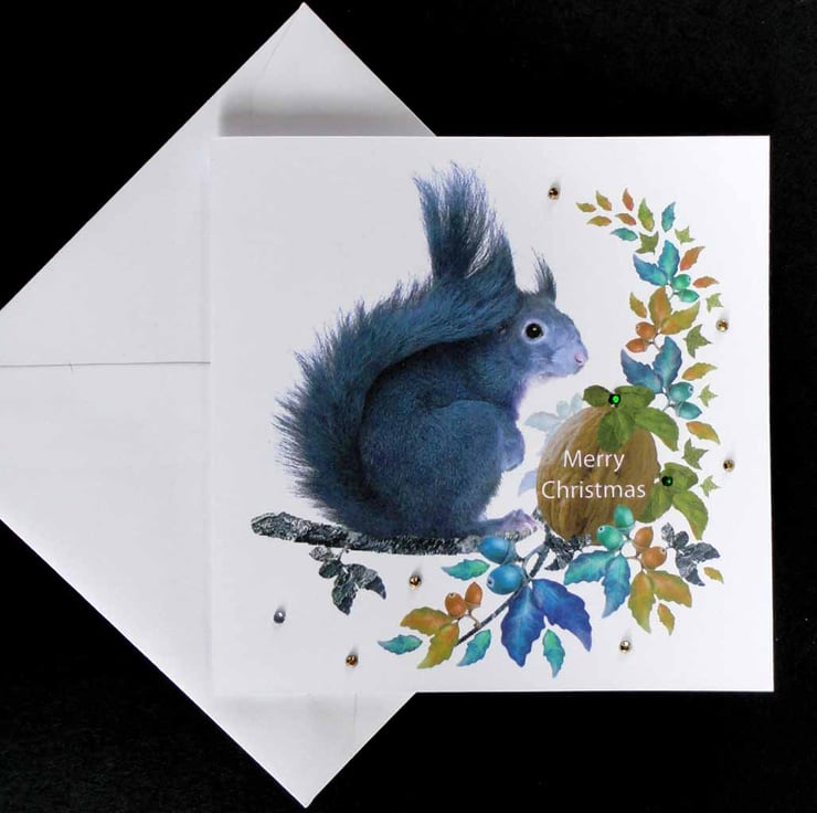 The second features the grey squirrel, who has been recoloured with a blue hue to enable him to compete with the stunning natural colour of the red squirrel. With the same foliage and acorns in different tones he too looks happy on his branch.