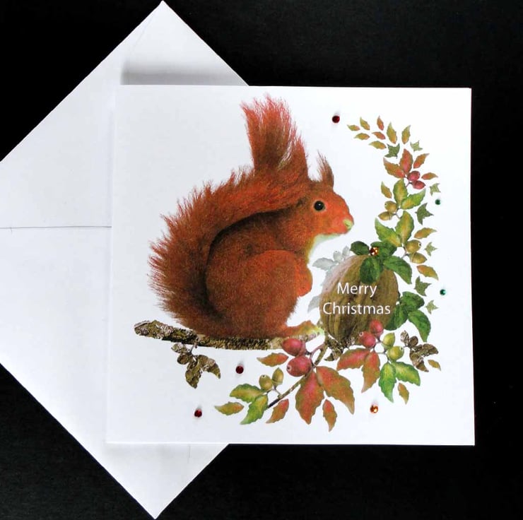 The first features the beautiful red squirrel perched on a branch of leaves and acorns in tones of red, orange and green. The message Merry Christmas is printed on a large walnut nestled in the foliage.