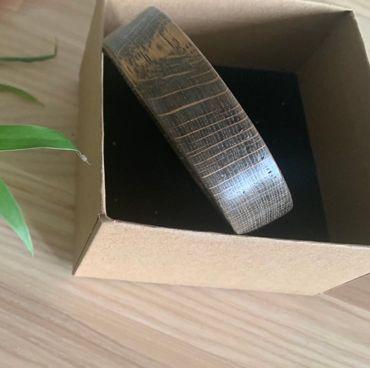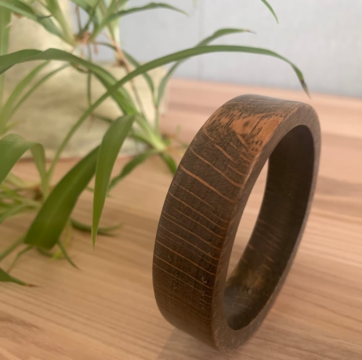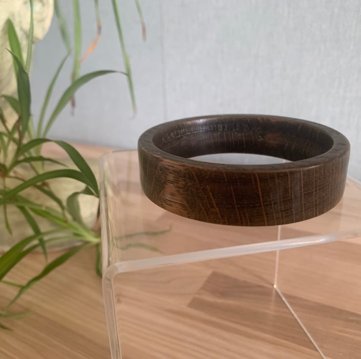 a small delicate bracelet, made from windblown Perthshire oak, showing the characteristic medullary rays. It hs been partially ebonised using a solution of wire wool and vinegar, which reacts with the natural tannins in the wood. After polishing the colour re-emerges producing a fascinating surface.