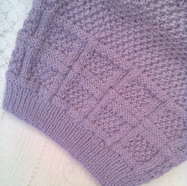 A textured box patterned jumper with a round neck and long sleeves hand knitted in double knitting weight yarn. The jumper is suitable for either a boy or a girl. It is in stock in this pretty lilac colour shown or it can be made for you in a size and colour of your choice, the available sizes and prices are shown below and please state the colour required when you order. The processing time for this jumper would be 1 - 2 weeks to produce and post to you.