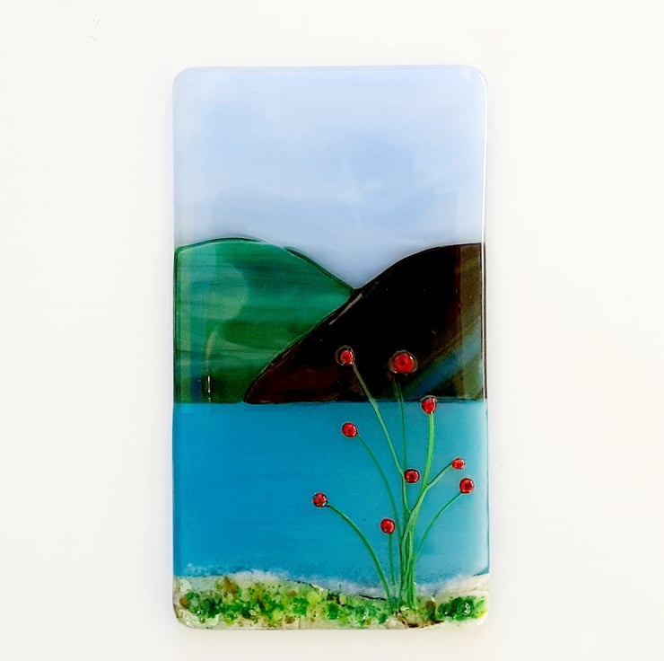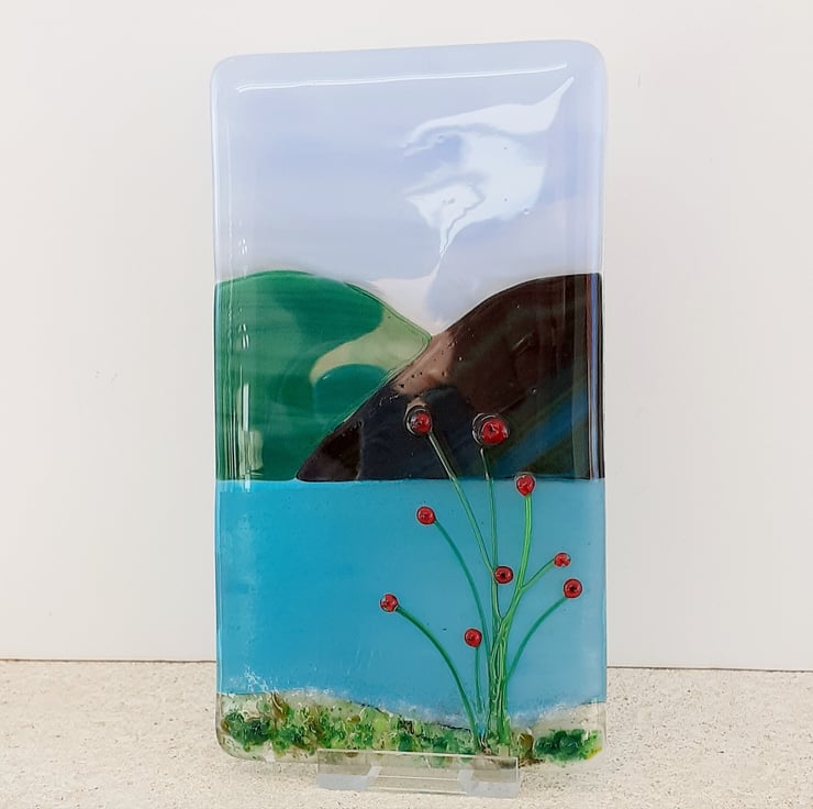 The panel has been created using two layers of streaky semi-opaque art glass to give a sense of depth, with the glass used for the water having a semi-matt finish. The piece has been decorated with coloured crushed art glass, stringers and murrini to build up the scene. Several kiln firings were required to achieve the smooth background and textured foreground foliage, which gives a pleasing tactile quality.