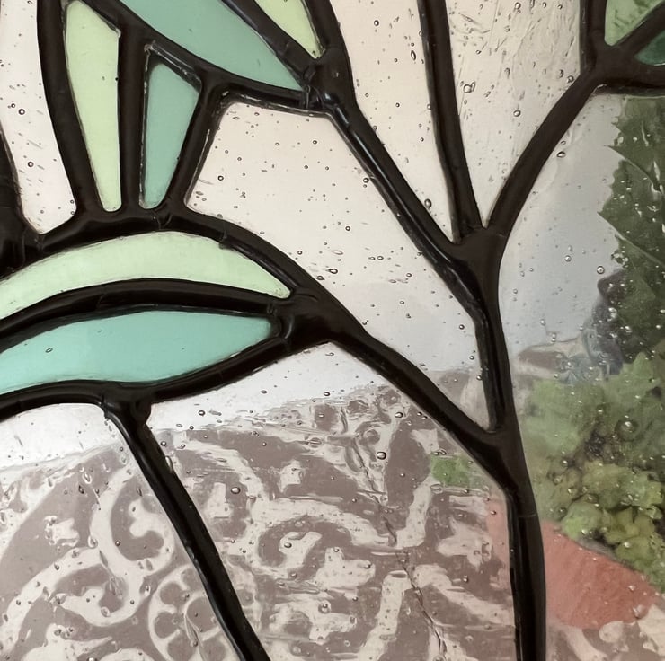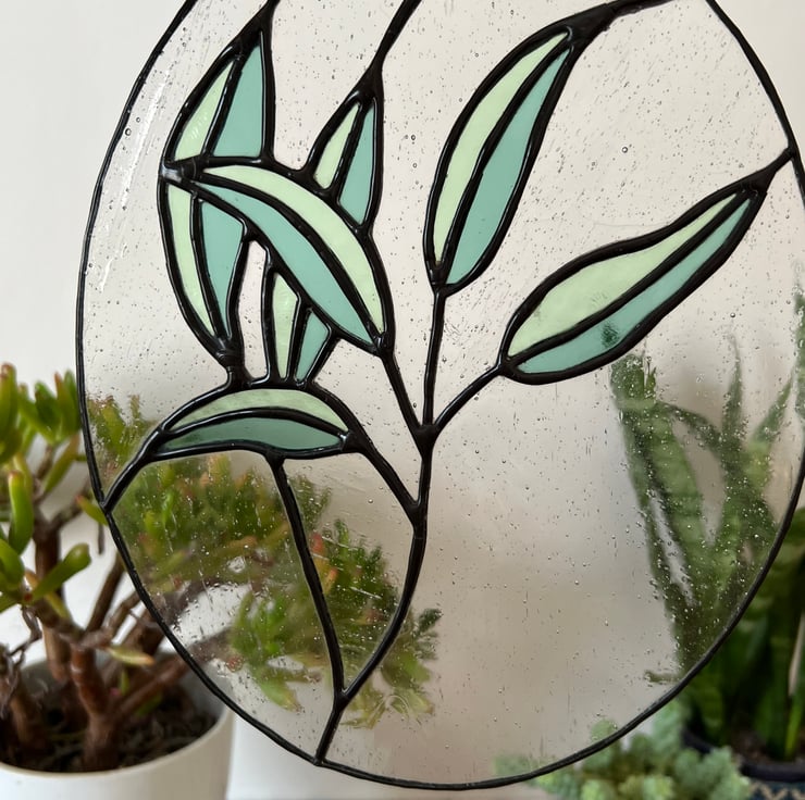 A delicate, minimal stained glass plant suncatcher that is perfect for any plant lover or people looking to carefully curate their home. The lilting two-tone plant leaves are outlined in a rich dark patina and surrounded by clear, speckled glass that adds interest. The clean, fresh colour scheme allows the piece to accent any home.