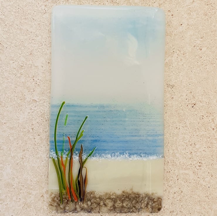 The panel has been created using two layers of glass to give a sense of depth, and decorated with coloured art glass powders and glass stringers to build up the scene. The sea is capped with a sheet of iridescent glass to give a subtle sheen. Several kiln firings were required to achieve the effect. The foreground seaspray and grasses are softly textured to give a pleasing tactile quality.