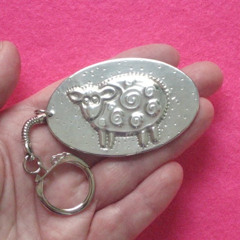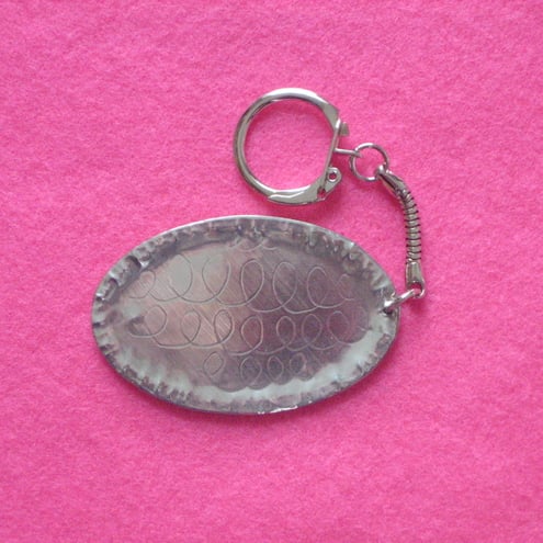 This keyring has been hand-made in shiny modern pewter. (The design has been raised on a piece of sheet pewter, the raised area has been filled,then mounted on a rigid base) The oval measures 60 x 37mm,and is light in weight.