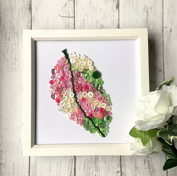 Looking for the perfect gift for the friend who has everything or a one-of-a-kind piece of artwork to add colour and cheer to your walls? This beautiful artwork, depicting a variegated philodendron leaf, ticks all the right boxes. The jewellike colours provide glitter and sparkle. No two pieces are exactly alike. Each leaf is lovingly created using buttons, mini beads and flatbacks.