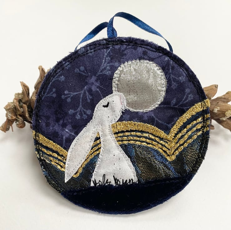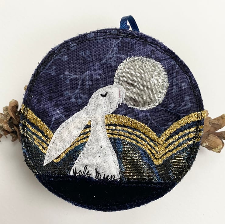 This charming embroidered hare home decorations shows a hare framed by a winter scene. It has been made from up-cycled fabrics and stitched down with free motion embroidery. It comes felt backed and measure approx 9.5cm diameter, with the ribbon the length is 18cm.