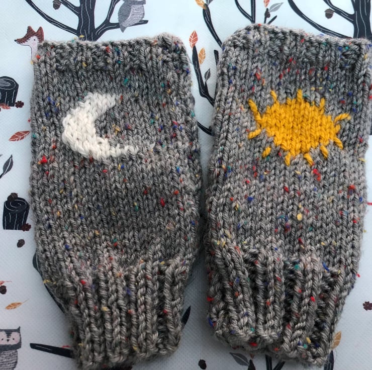 Features a sun on one hand and moon on the other these fit a small/medium hand .