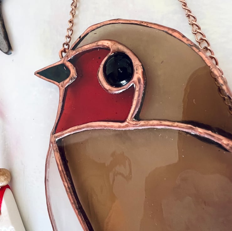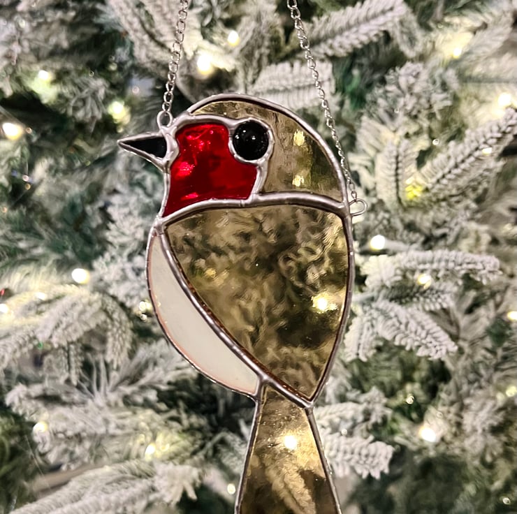 Adorable stained glass robin with a lively domed eye, vibrant red breast and walnut and wispy white plumage. Perfect spring songbird decoration for your home or as a beautiful Christmas gift. These robins may just be too cute to give away - perhaps you should buy two?
