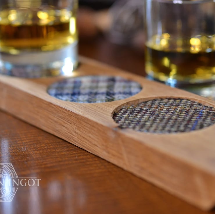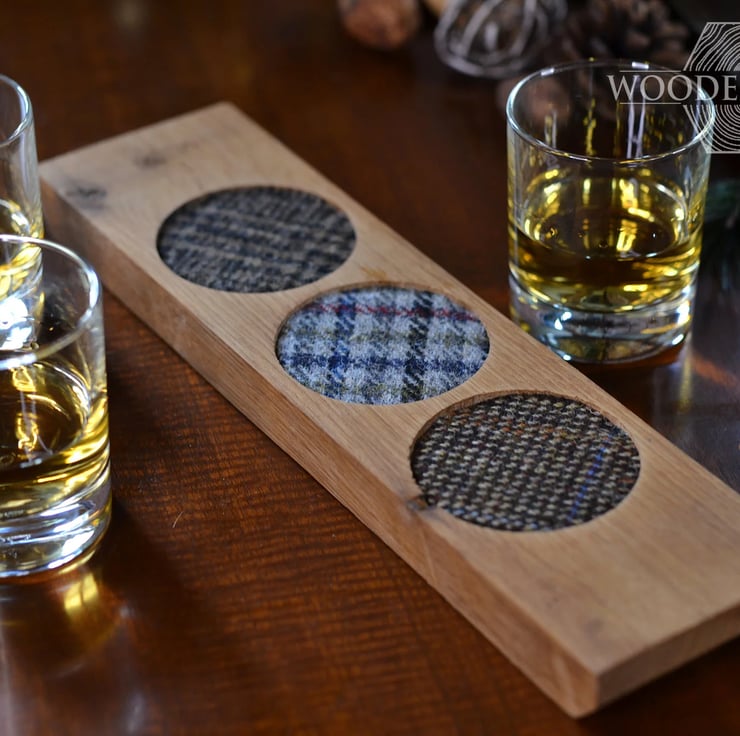 This whisky tasting tray has been made with handcut oak and genuine Scottish Harris Tweed cotton glass pads, sealed with natural wax to maintain the wood’s natural beautiful colours.