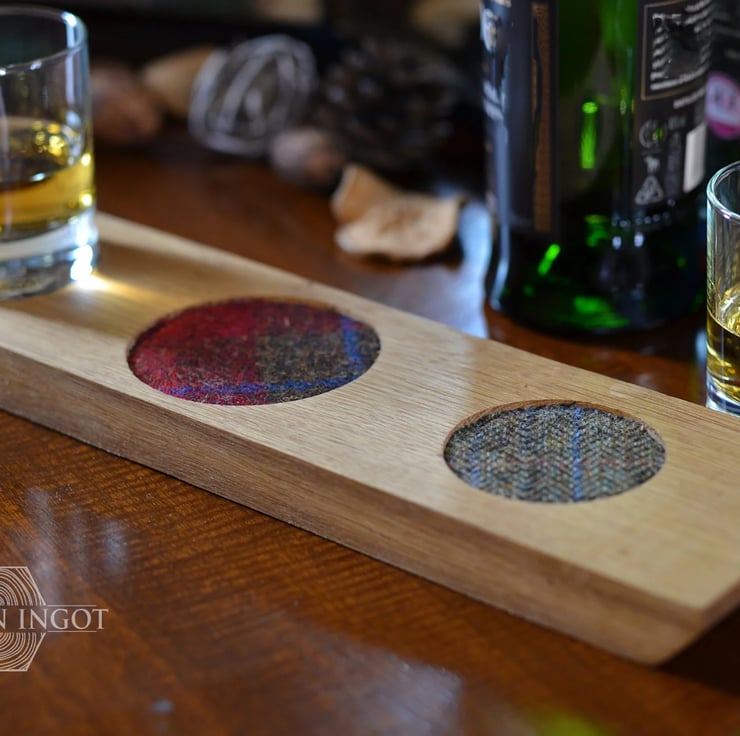 This whisky tasting tray has been made with handcut oak and genuine Scottish Harris Tweed cotton glass pads, sealed with natural wax to maintain the wood’s natural beautiful colours.