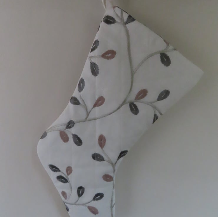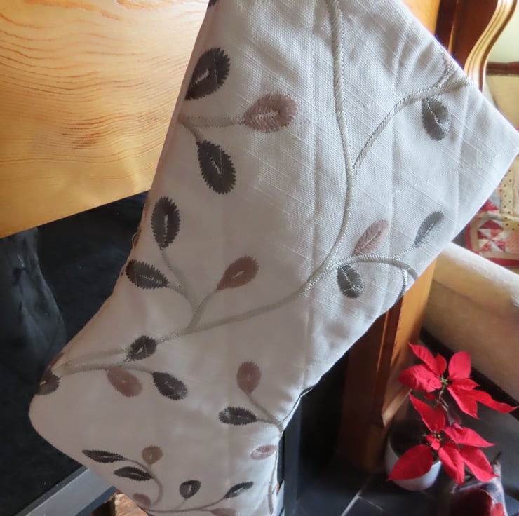 This unique Christmas Stocking is handmade from rescued upholstery fabric. It is completed with machine, cross hatch quilting and is fully lined with a silver, grey, sateen fabric.