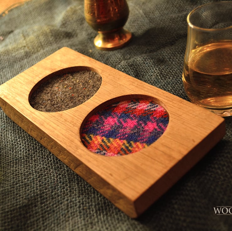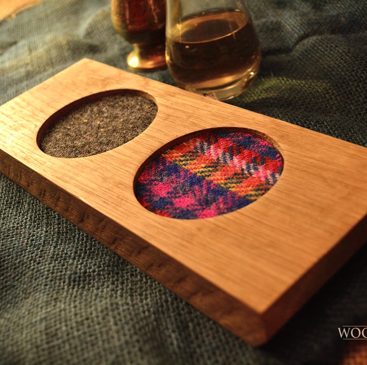 This whisky tasting tray has been made with handcut oak and genuine Scottish Harris Tweed cotton glass pads, sealed with natural wax to maintain the wood’s natural beautiful colours.