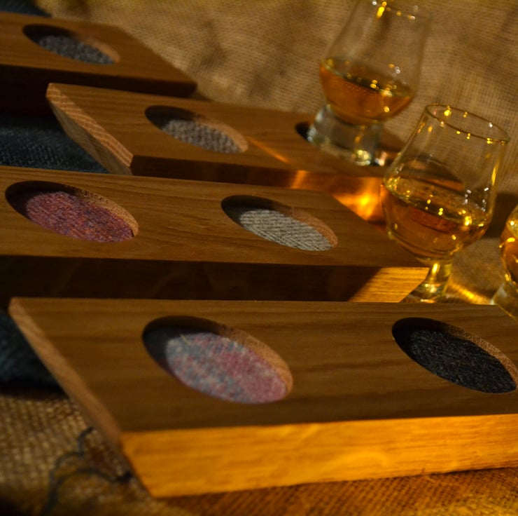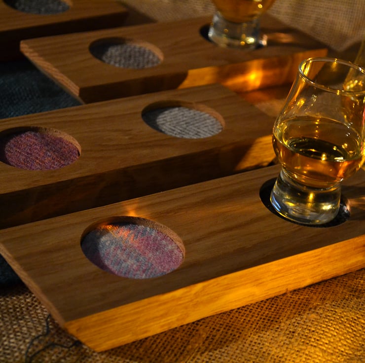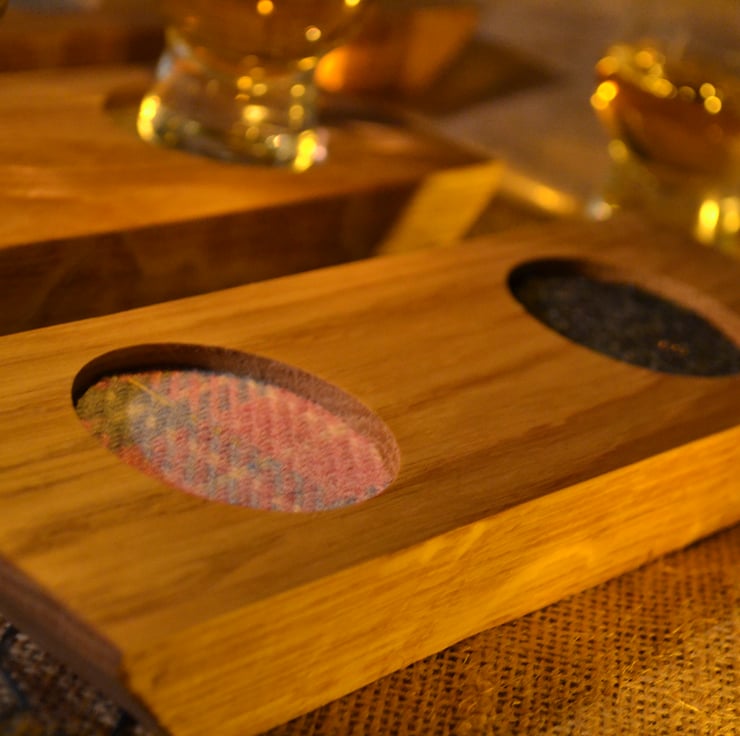 This whisky tasting tray has been made with handcut oak and genuine Scottish Harris Tweed cotton glass pads, sealed with natural wax to maintain the wood’s natural beautiful colours.