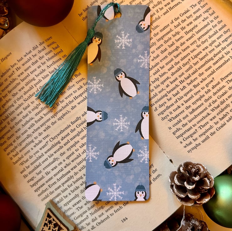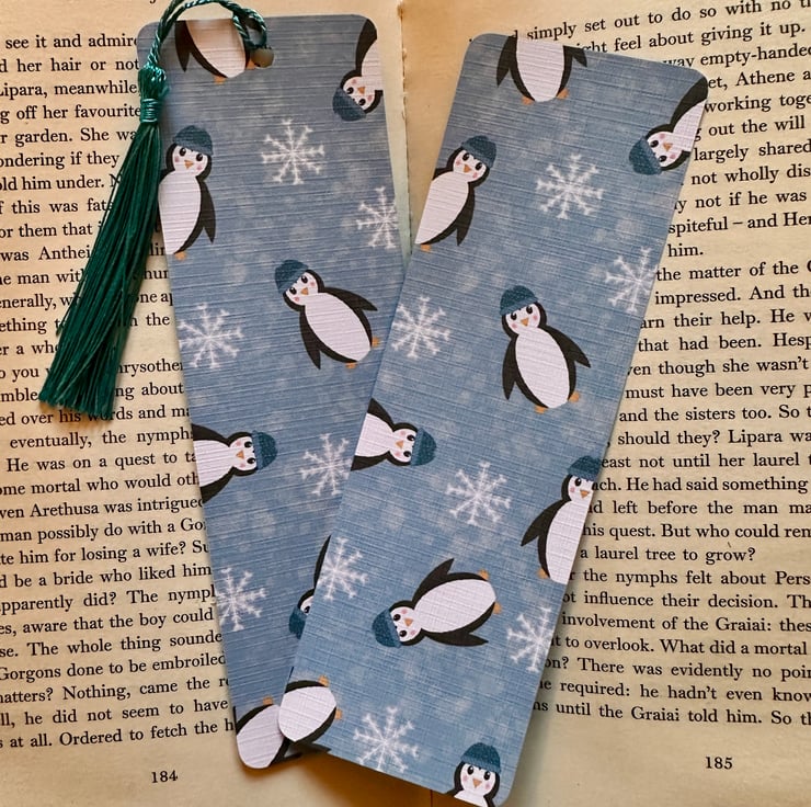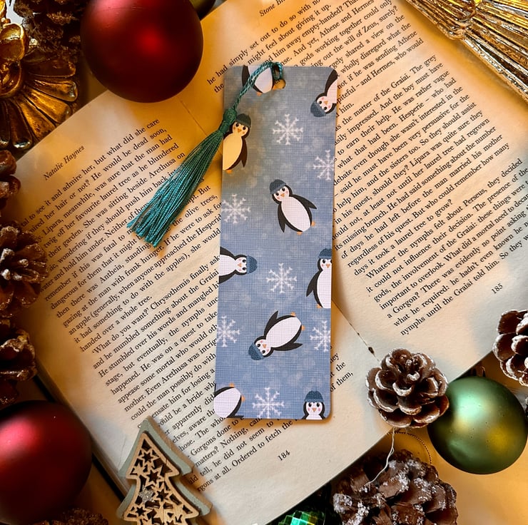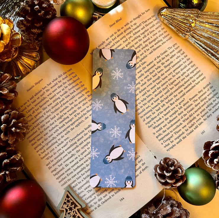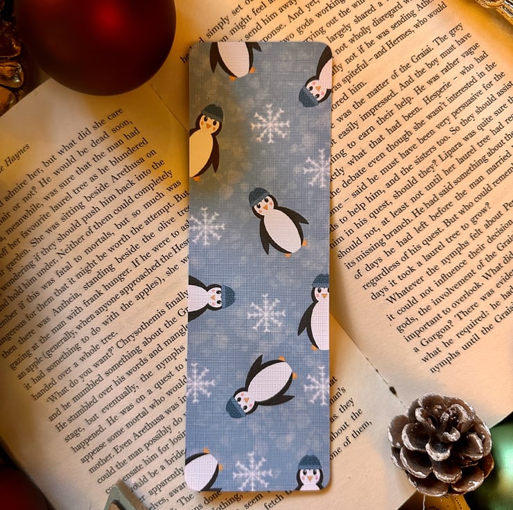 Bring a whimsical winter vibe to your reading with this adorable hand-drawn bookmark featuring playful penguins in cozy hats surrounded by delicate snowflakes on a frosty blue background. Perfect for the colder months, this bookmark makes a great stocking filler, a thoughtful gift for book lovers, or a delightful treat for yourself.