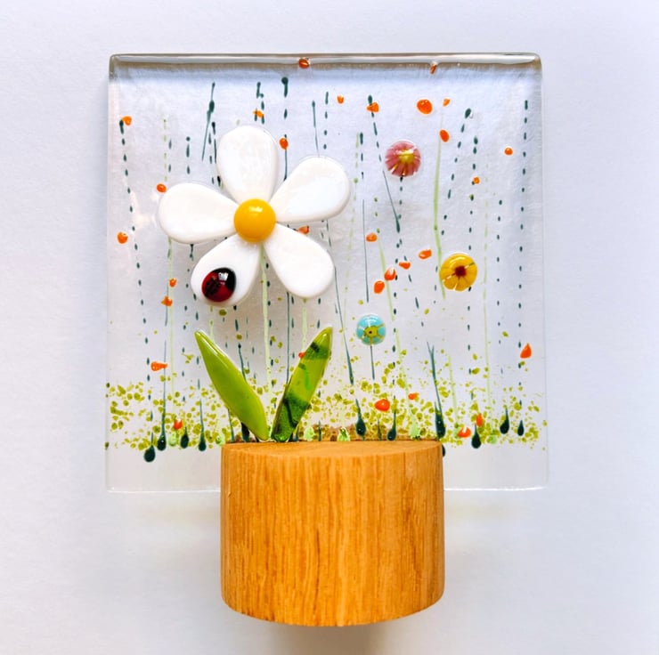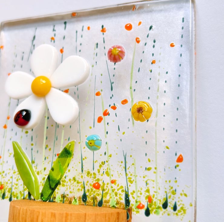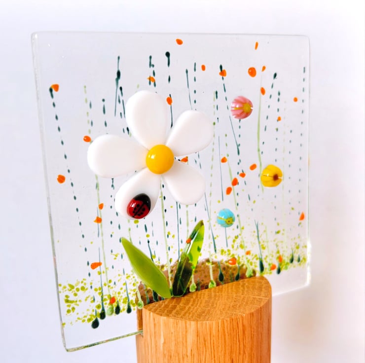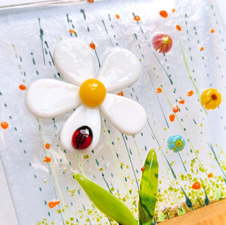 This beautiful daisy panel has been hand crafted from different pieces of glass and also includes cute millefiori flowers and even a little ladybird!