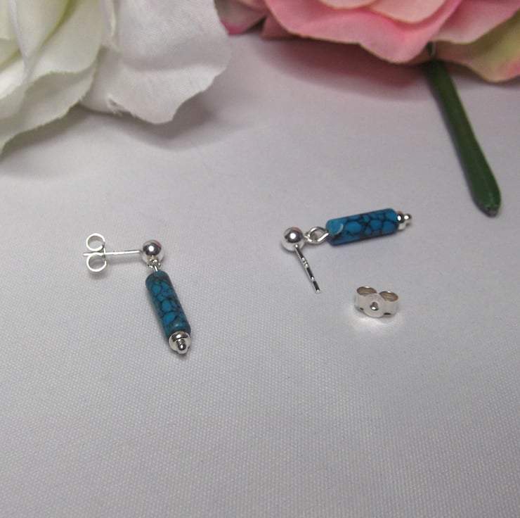 Featuring beautiful long thin Turquoise gemstone beads finished off with a small flat silver ring & ball finial and come complete with silver ear posts and butterfly backs, the drop length from the ear post is approx. 2 cm. The ear post and butterfly backs are all made from recycled sterling silver.