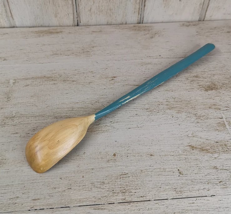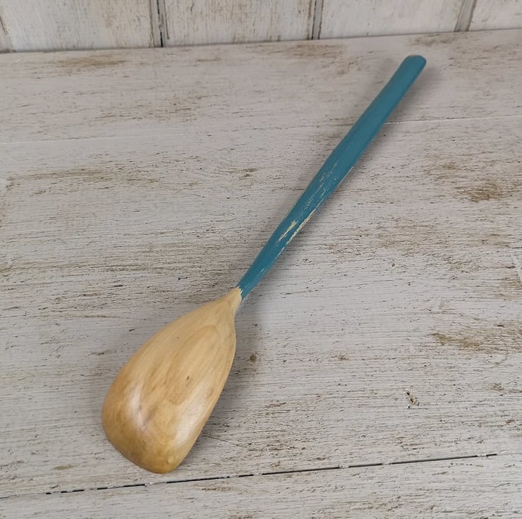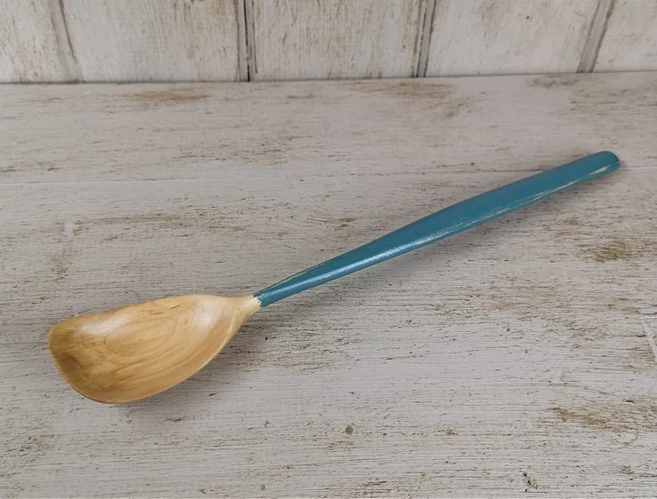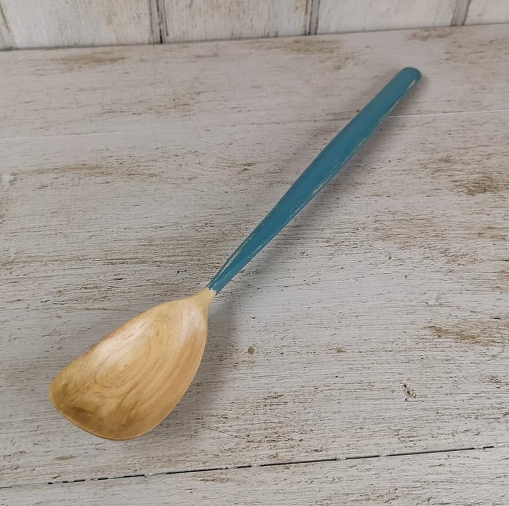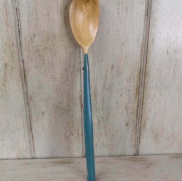 Distressed Vintage Blue handle, the spoon then finished with 3 coats of Mineral Oil, which not only gives the spoon a lovely hard wearing finish, it is also food safe.