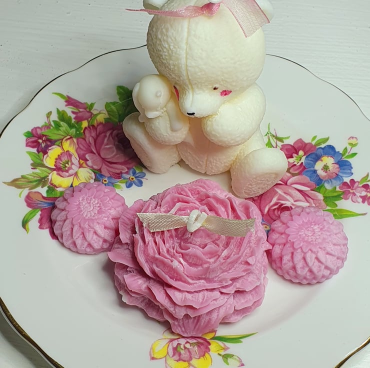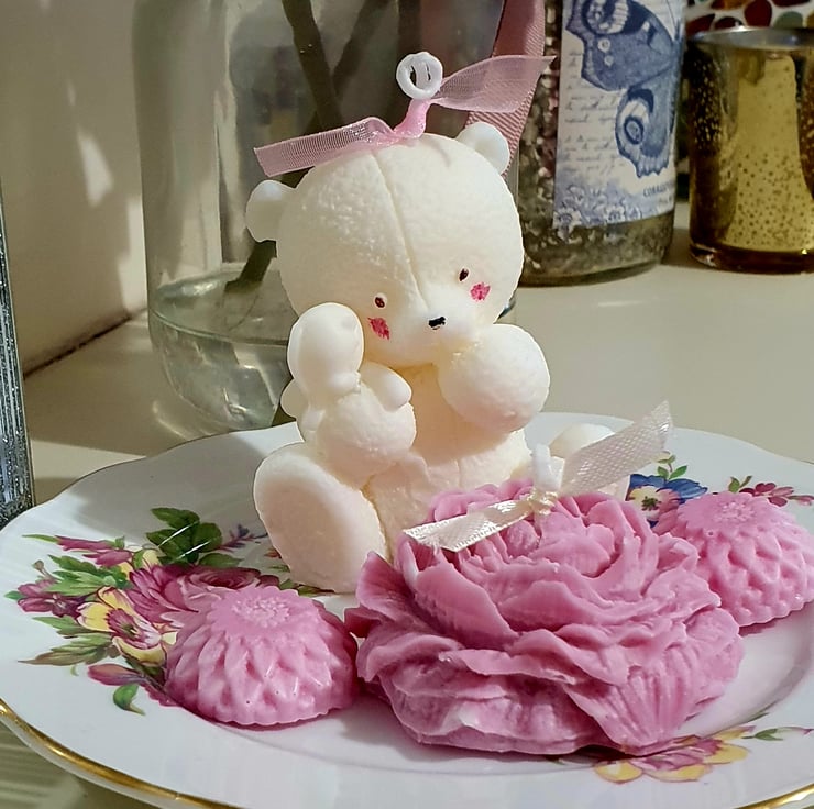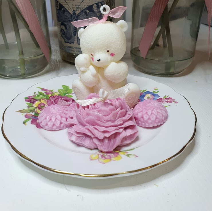Cute Teddy bear Candle. On its own vintage saucer. With a peony Candle. All handmade and Hand poured with love. Scented and made with Soy Wax. Hand painted Teddy. Perfect for your own home or as a beautiful unique gift.