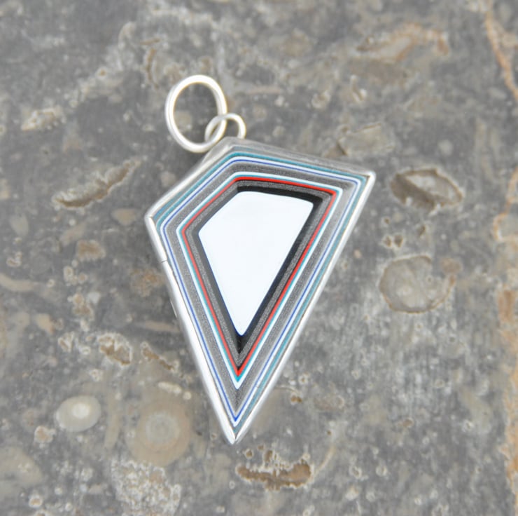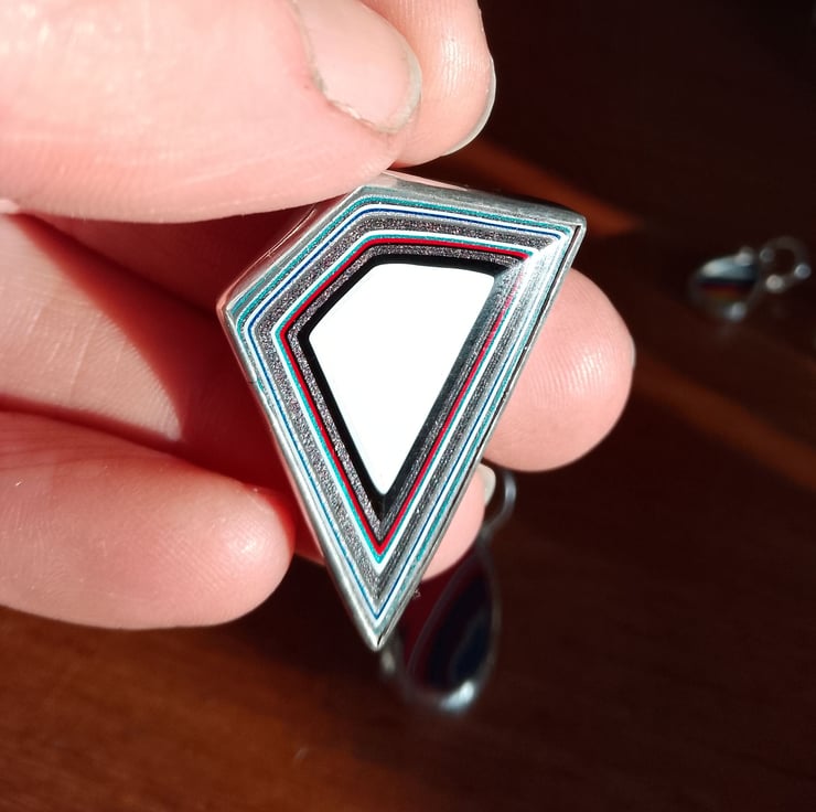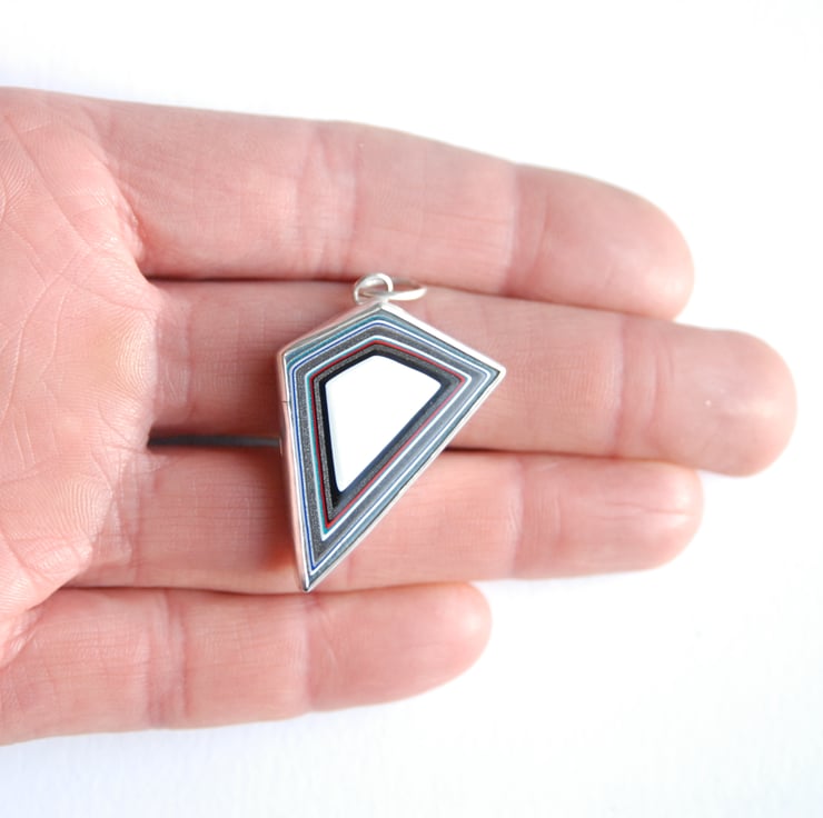 This geometric necklace features an angular piece of fordite with an eye catching pattern in black, white, grey with a little red and teal. The fordite has an unusual trapezoid shape which is emphasised by the pattern of concentric rings. The fordite measures approx 34mm top to bottom and 27mm across with a bail attached at one of the points. It comes complete with a sterling silver chain but the generous 8mm bail would fit a ribbon or leather cord if you wanted to switch it over. It would make a great gift for anyone who loves their cars or anything a bit unusual.