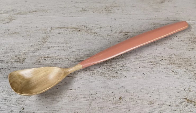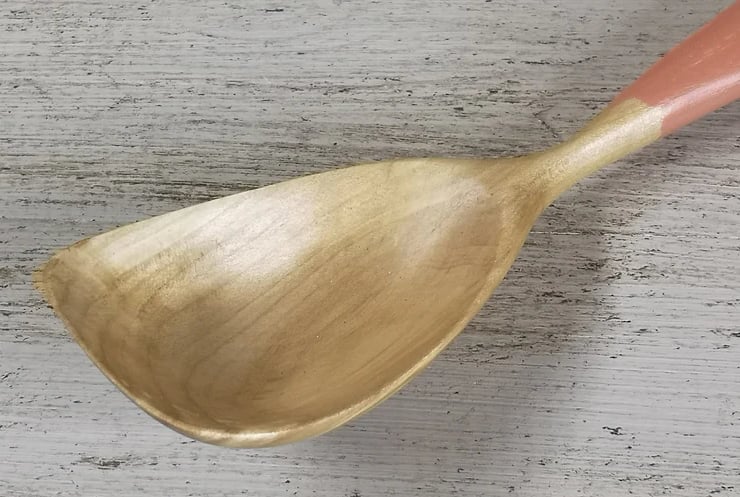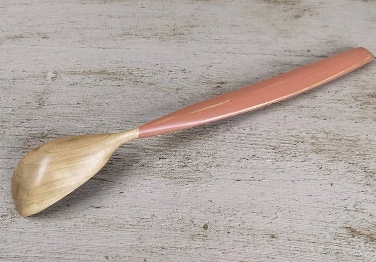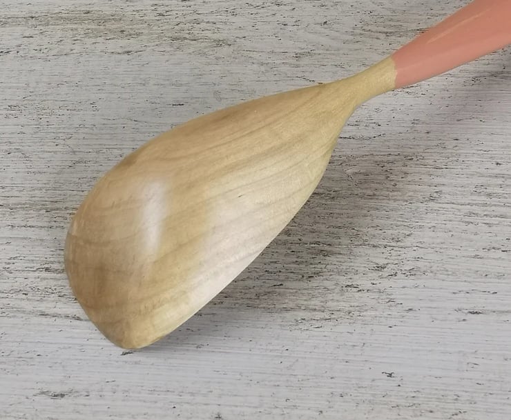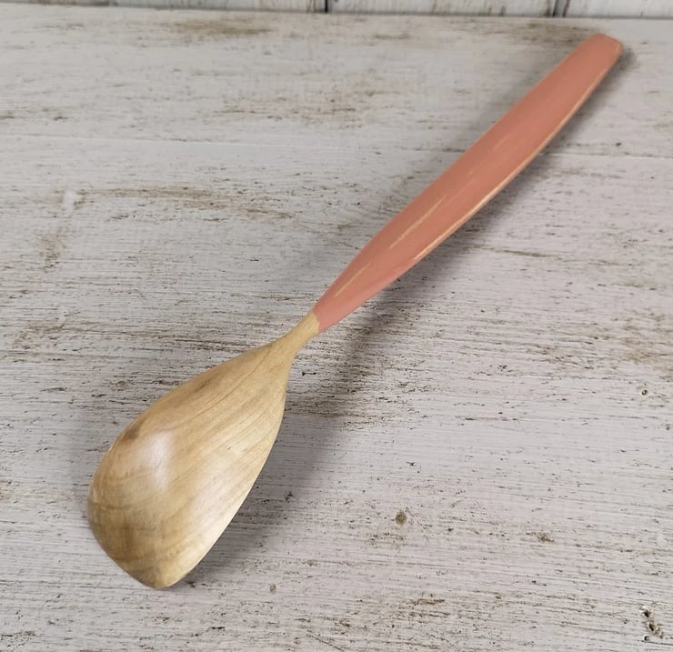 Distressed vintage Cadmium Red painted handle, the spoon then finished with 3 coats of Mineral Oil, which not only gives the spoon a lovely hard wearing finish, it is also food safe.