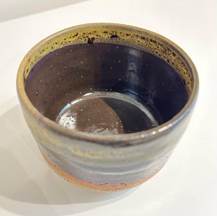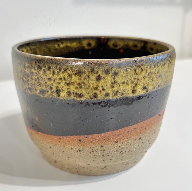A hand thrown pot with a dark brown shiny glaze under oatmeal glaze on a Lavafleck speckled stoneware clay.