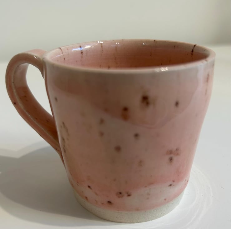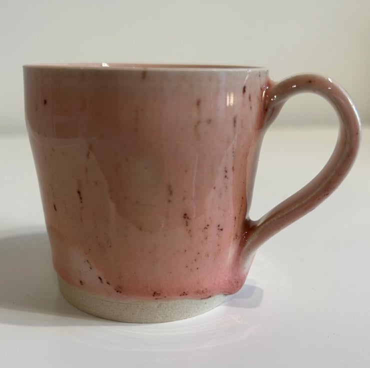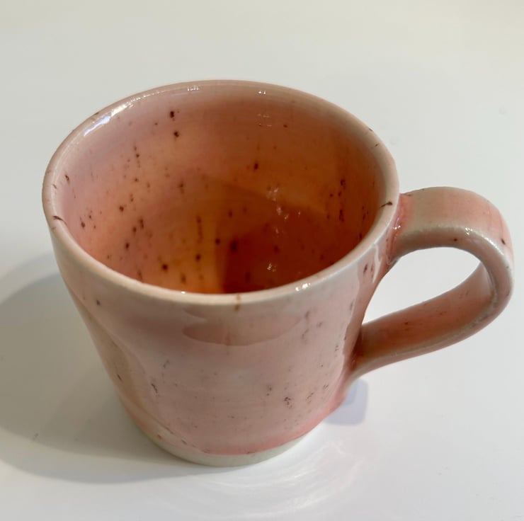 A hand thrown textured Espresso cup with a beautiful pink mottled shiny glaze