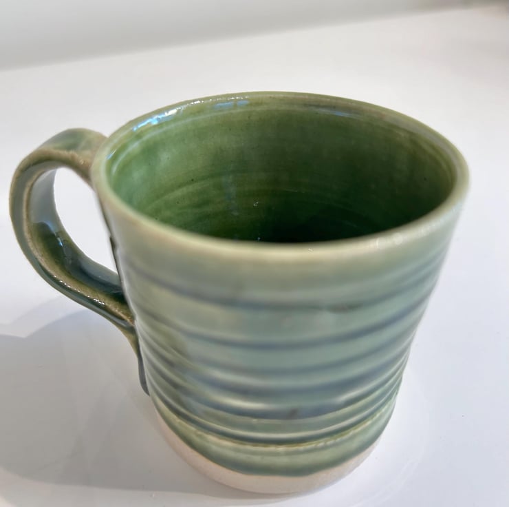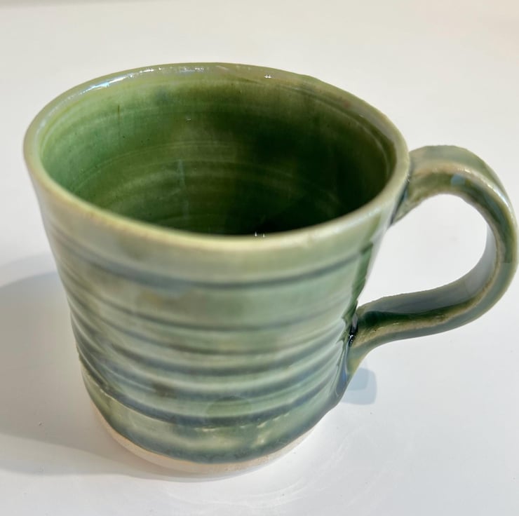 A hand thrown textured Espresso cup with a beautiful dark green shiny glaze