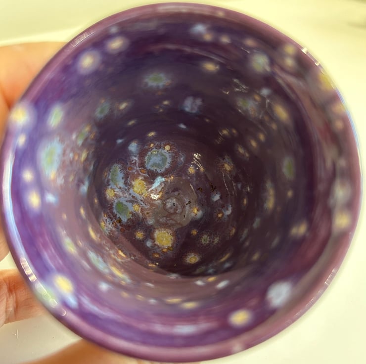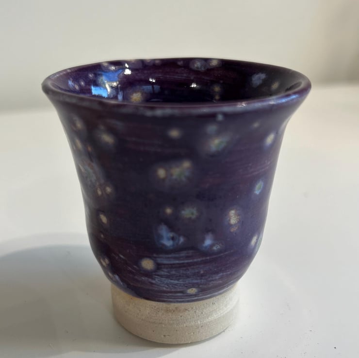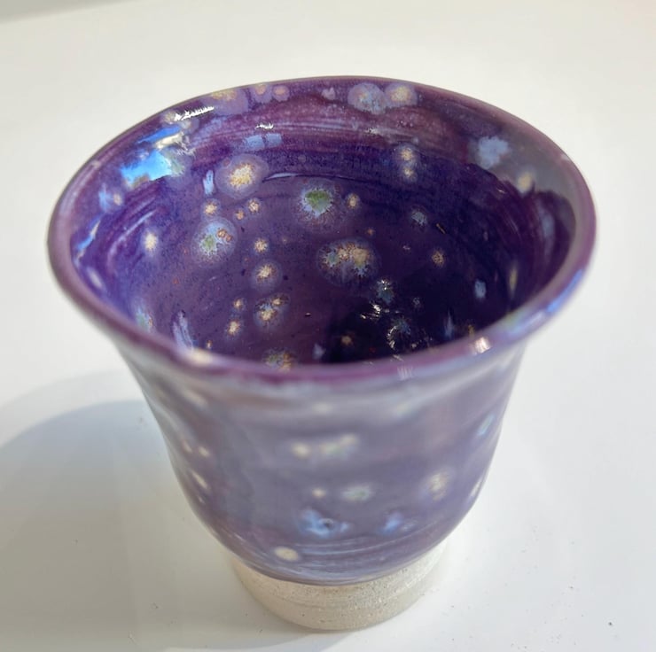 A small pot with a purple galley like glaze