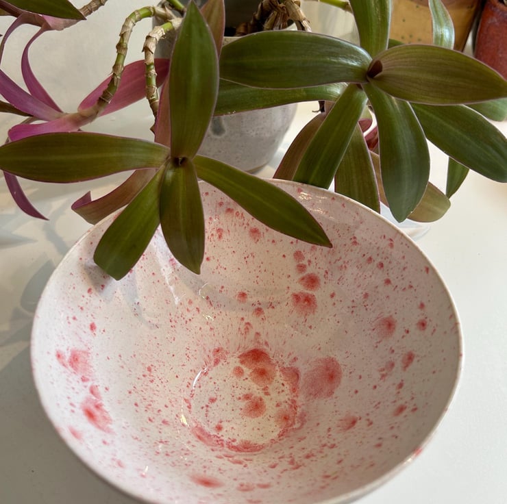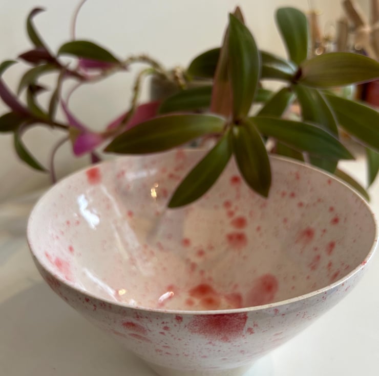 Hand thrown decorative bowl in a beautiful pink splodgy glaze.