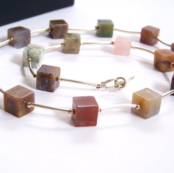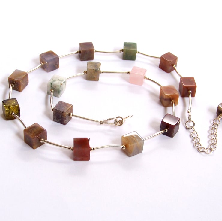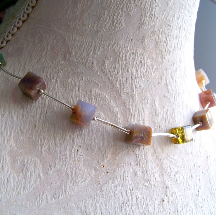 This lovely piece is adorned with delicate silver bugle beads that elegantly separate each gemstone.