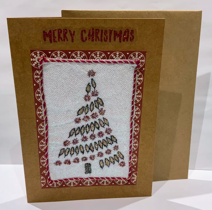A textile card showing a spartkly modern design Christmas tree which has been hand painted and embroidered with metalic threads on a sparkle cotton background Framed with festive twine and mounted on a snowflake border on an A5 brown card with a sparkle red Merry Christmas at the top of the design. Comes with matching envelope.