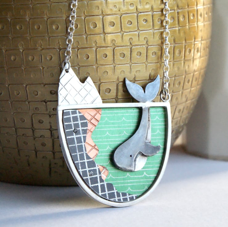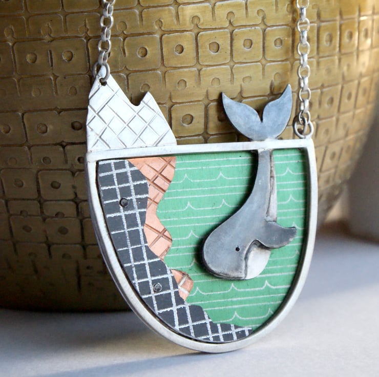 An unusual statement necklace featuring a whale diving into the sea. This necklace is made from anodised aluminium and sterling silver and each piece has been carefully cut with a piercing saw and constructed in layers. The coloured aluminium pieces are patterned with a resist and immersion dyed. The silver and copper pieces have been textured in part and the whale is partly oxidised. The sterling silver chain is adjustable in length and can be worn between approx. 16-19 inches.