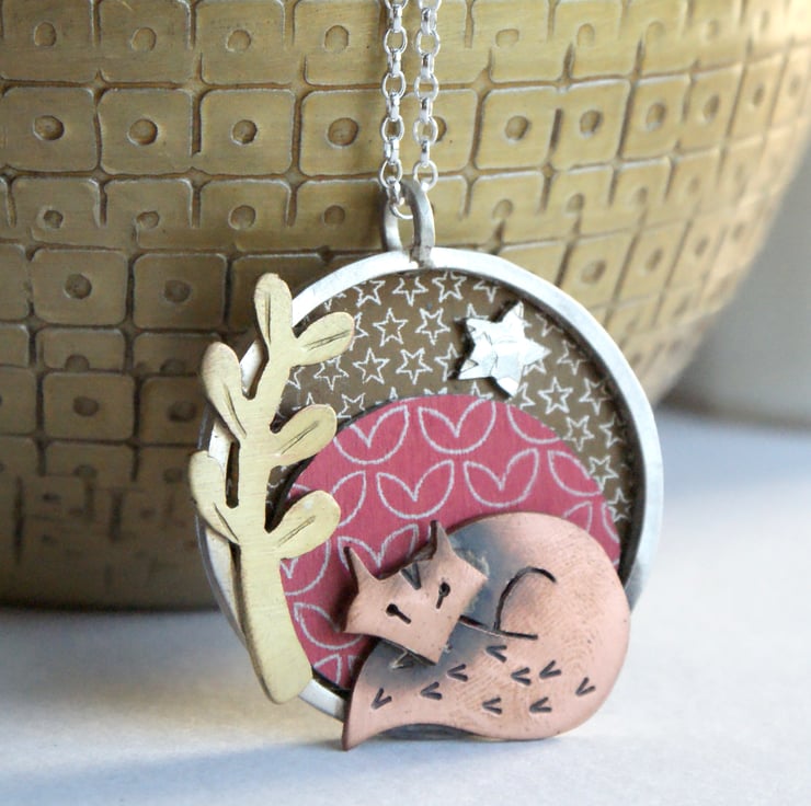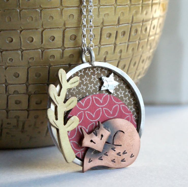 A striking necklace featuring a sleepy fox in his own little landscape. This necklace is made from anodised aluminium, sterling silver, brass and copper and each piece has been carefully cut with a piercing saw and constructed in layers. The coloured aluminium pieces are patterned with a resist and immersion dyed. Hung from an 18 inch sterling silver chain. (Other lengths available).