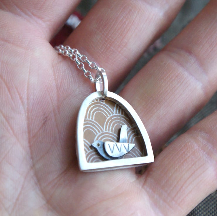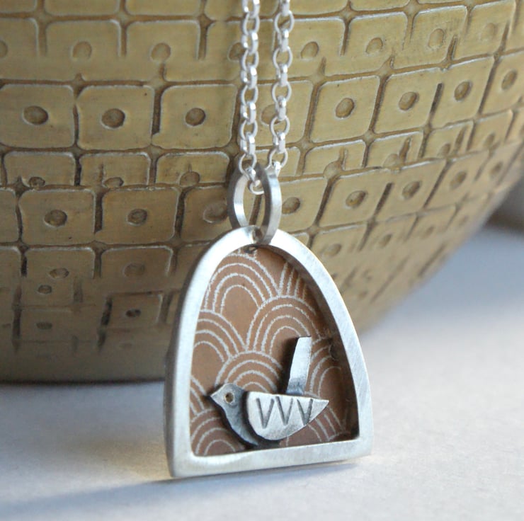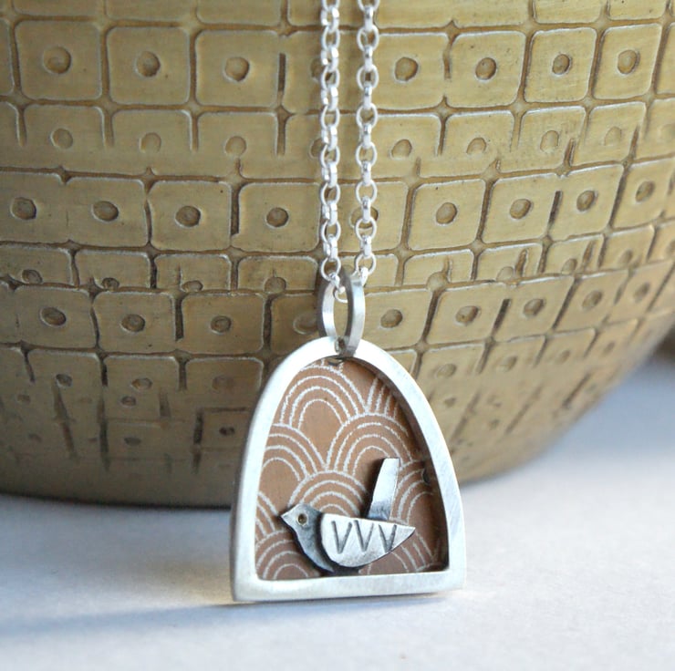 Perfect form adding a pop of colour to an outfit, this cute necklace is made from anodised aluminium and sterling silver. Each piece has been carefully cut with a piercing saw and constructed in layers. The coloured aluminium piece is patterned with a resist and immersion dyed. Hung from an 18 inch sterling silver chain. (Other lengths available, please ask)