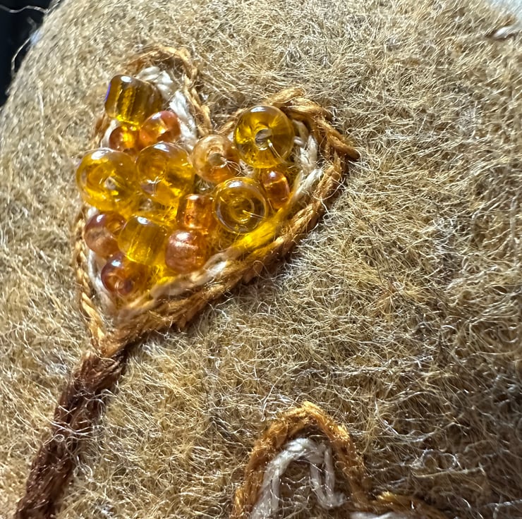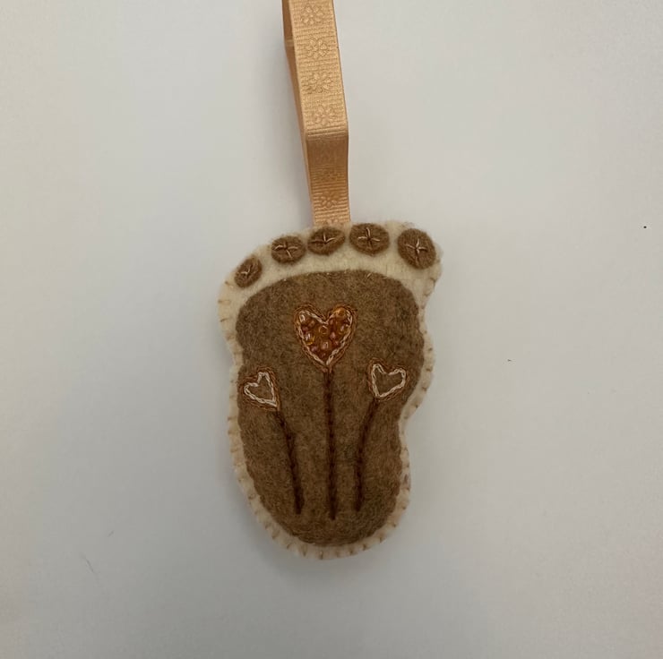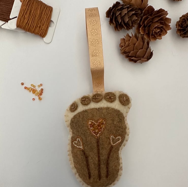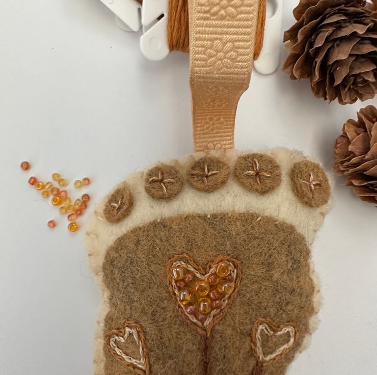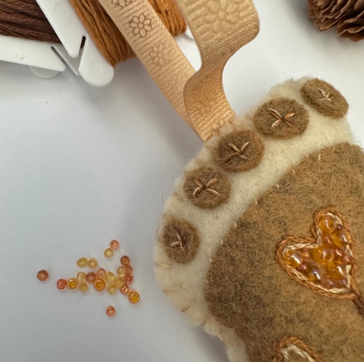 Made using the softest, quality, high (40%) felt, DMC cotton threads, glass seed beads it also has a pretty contrasting satin ribbon imprinted with flowers to hang it with.