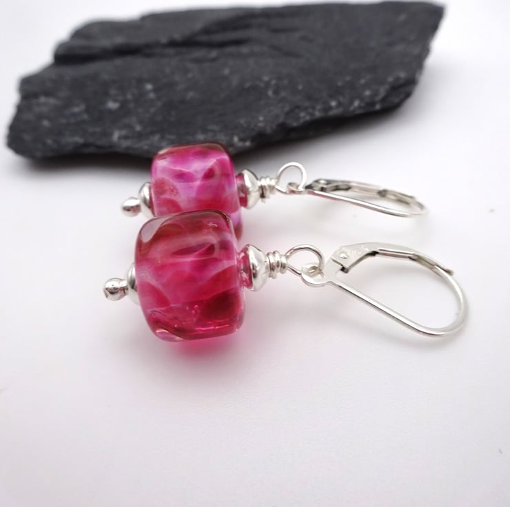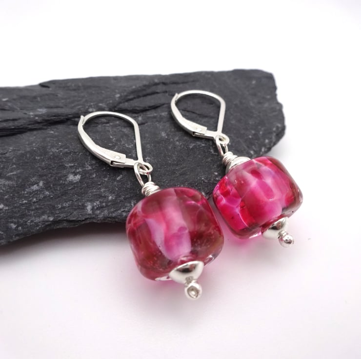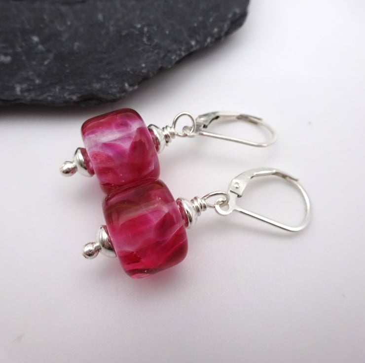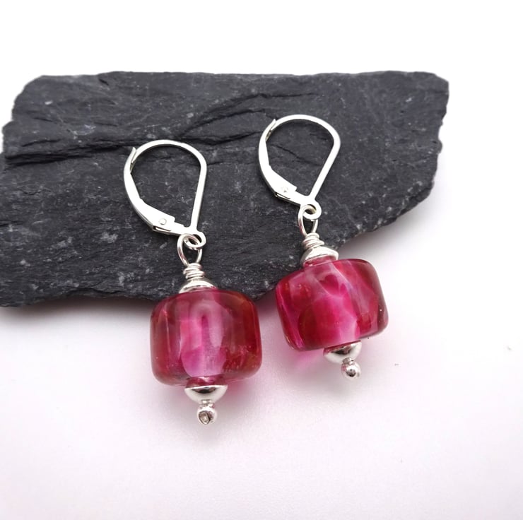 They feature sterling silver lever back ear wires and handmade lampwork dark pink glass beads.