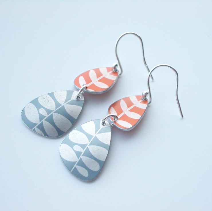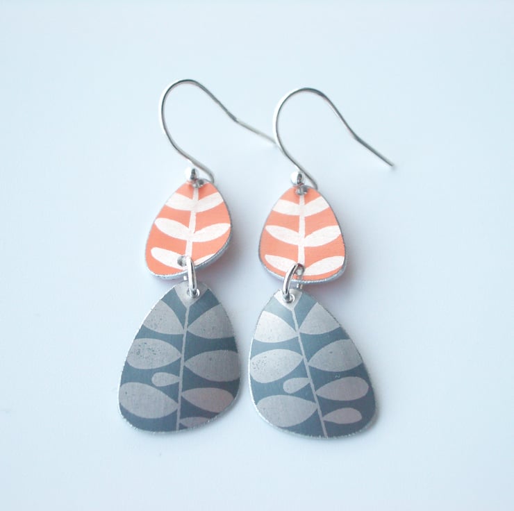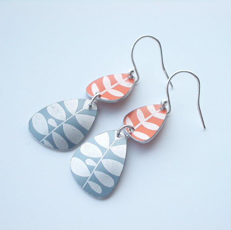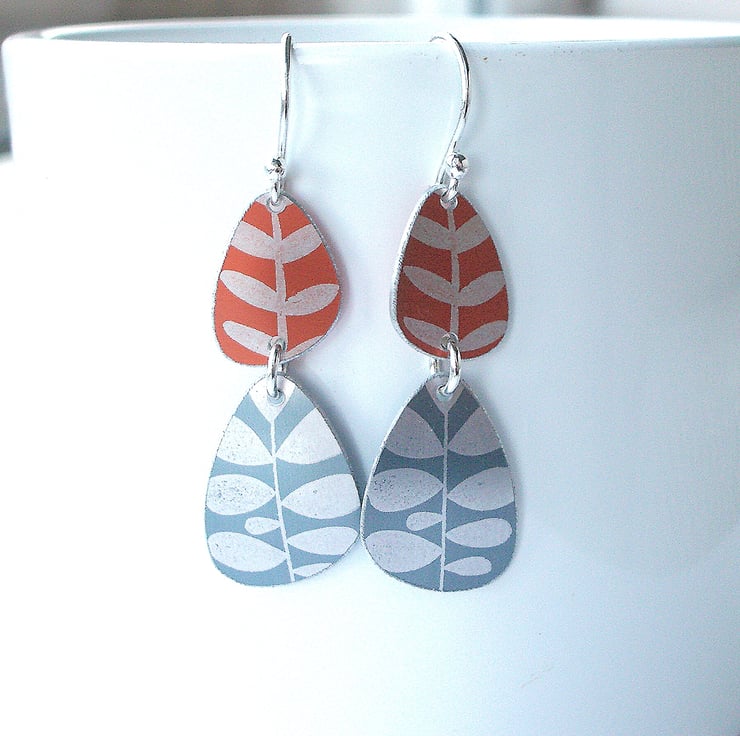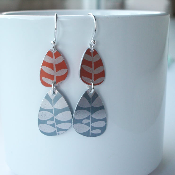 These mid century inspired earrings are made from anodised aluminium which I have dyed in orange and grey and printed with a leaf design. I cut the pebble shapes by hand using a jeweller’s saw and file the edges to give a nice smooth finish. Finally I dome the pebble shapes so that they catch the light.