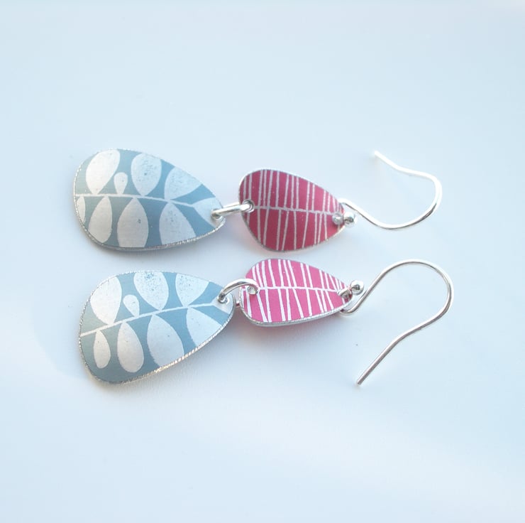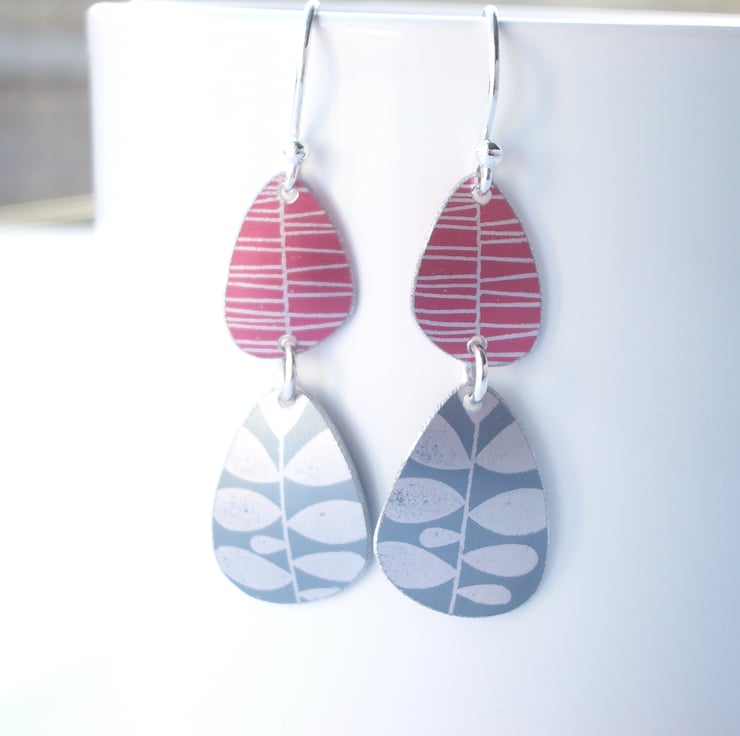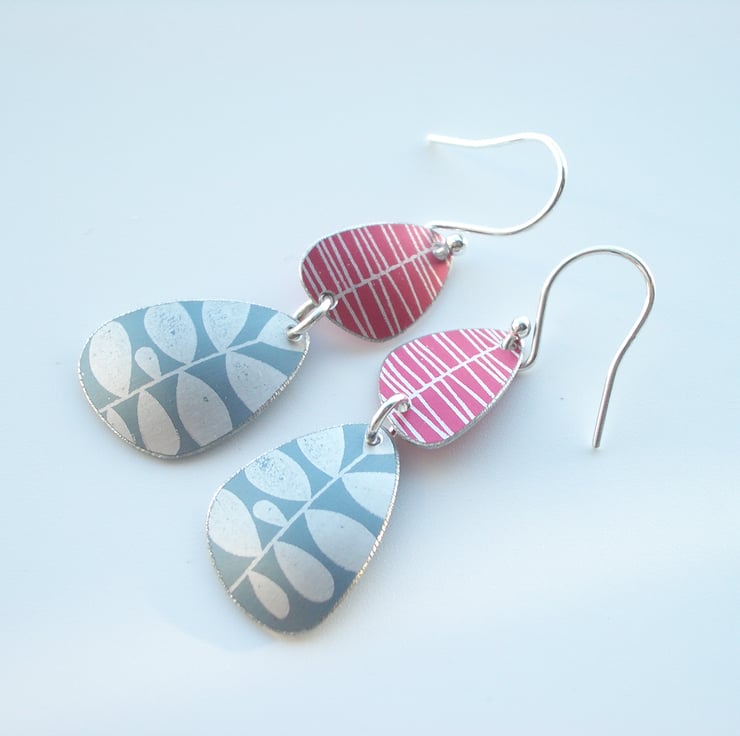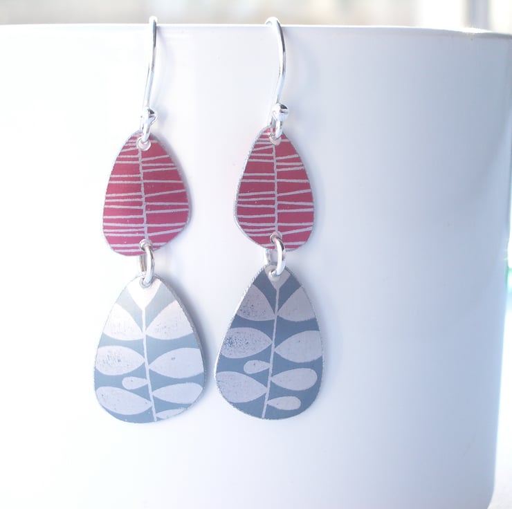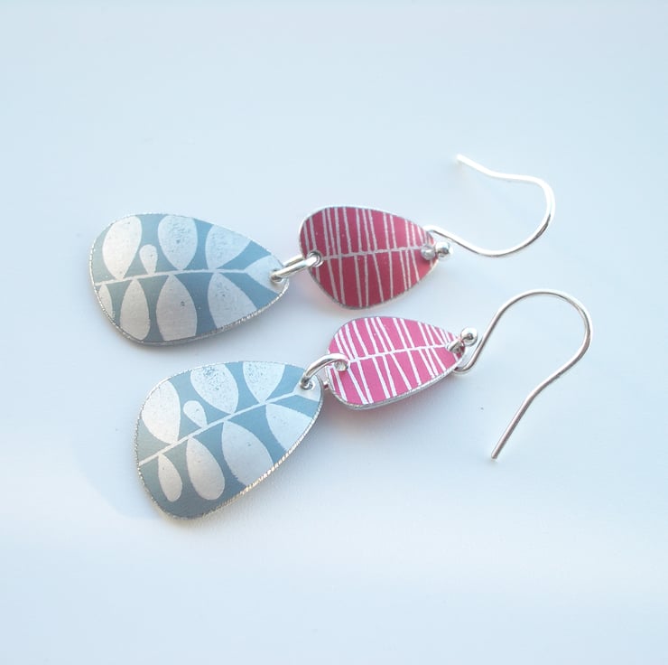 These mid century inspired earrings are made from anodised aluminium which I have dyed in red and grey and printed with a leaf design. I cut the pebble shapes by hand using a jeweller’s saw and file the edges to give a nice smooth finish. Finally I dome the pebble shapes so that they catch the light.