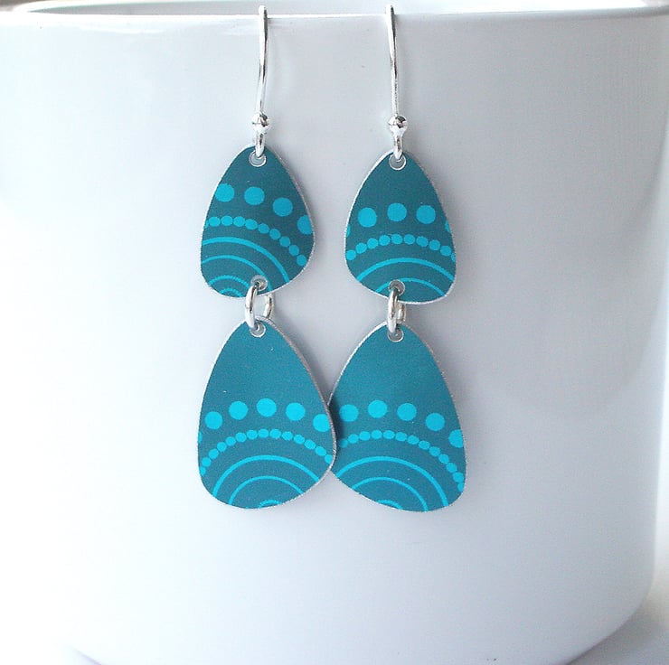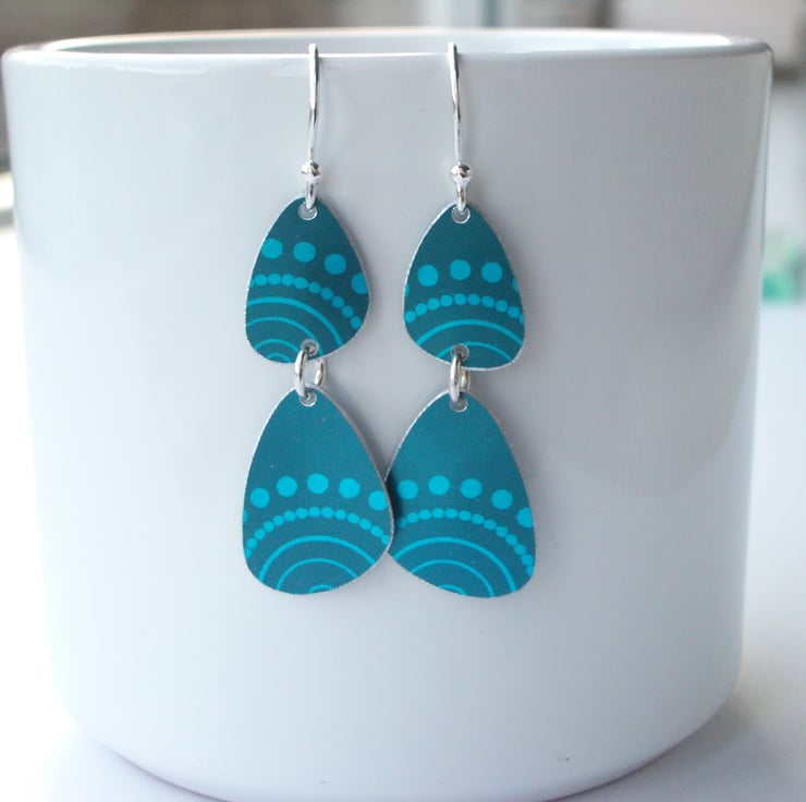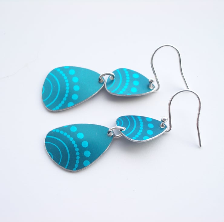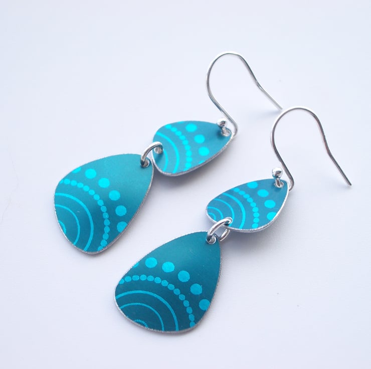 These mid century inspired earrings are made from anodised aluminium which I have dyed in turquoise and teal and printed with an abstract design. I cut the pebble shapes by hand using a jeweller’s saw and file the edges to give a nice smooth finish. Finally I dome the pebble shapes so that they catch the light.