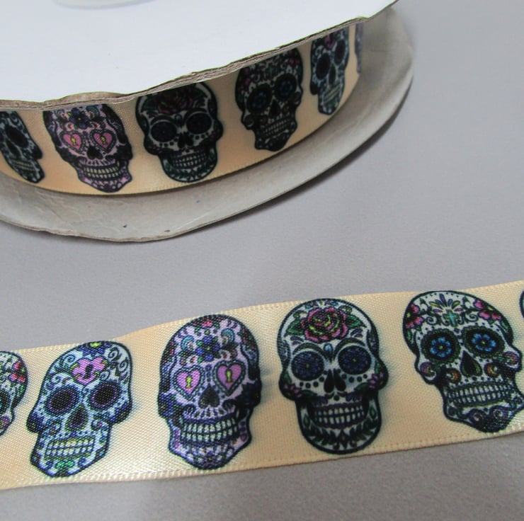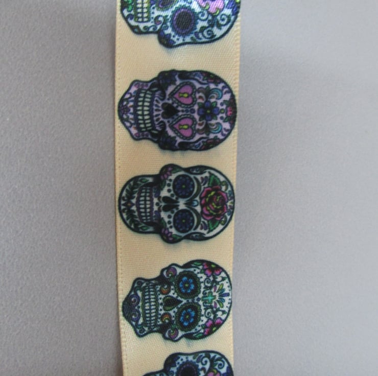 GOLD SUGAR SKULL DAY OF THE DEAD RIBBON SOLD BY THE METRE.