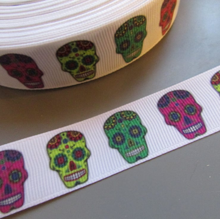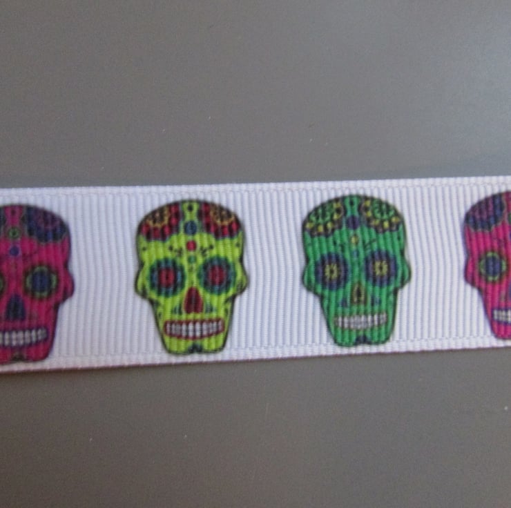 WHITE GOTHIC SUGAR SKULL PATTERNED GROSGRAIN RIBBON SOLD BY THE METRE.
