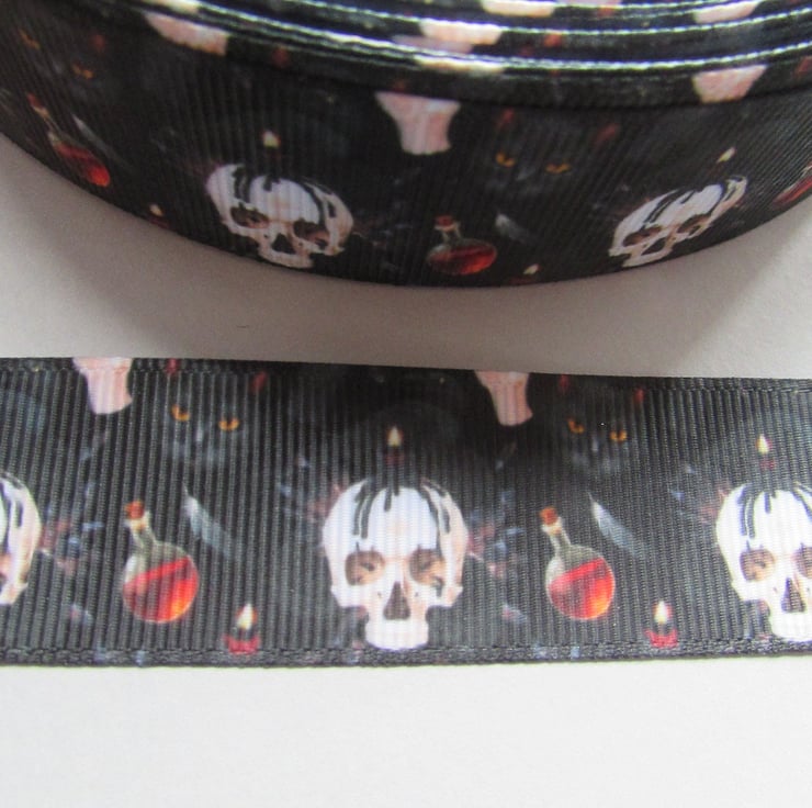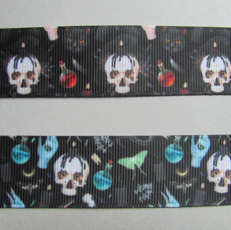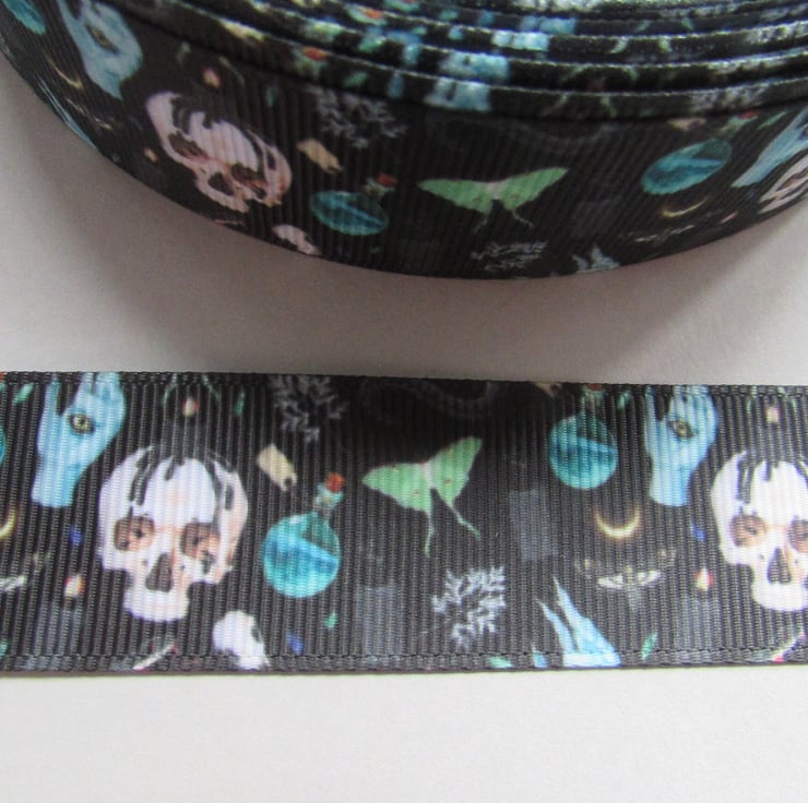 Mystic Potion Bottle, Skull, Moth, Cat Grosgrain Ribbon x 1 metre