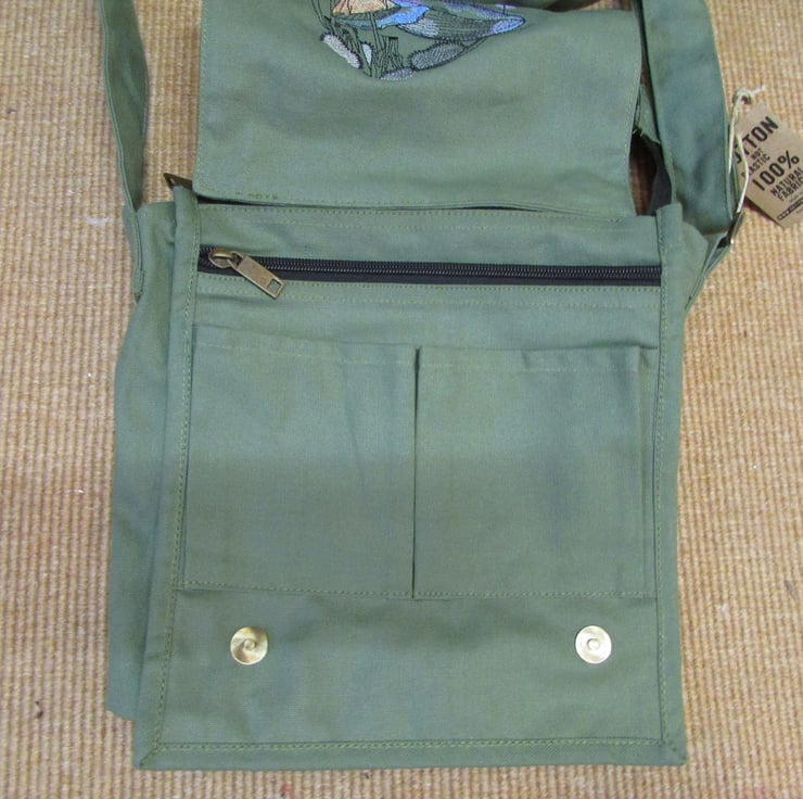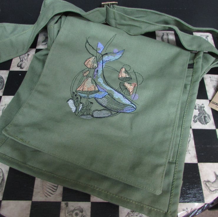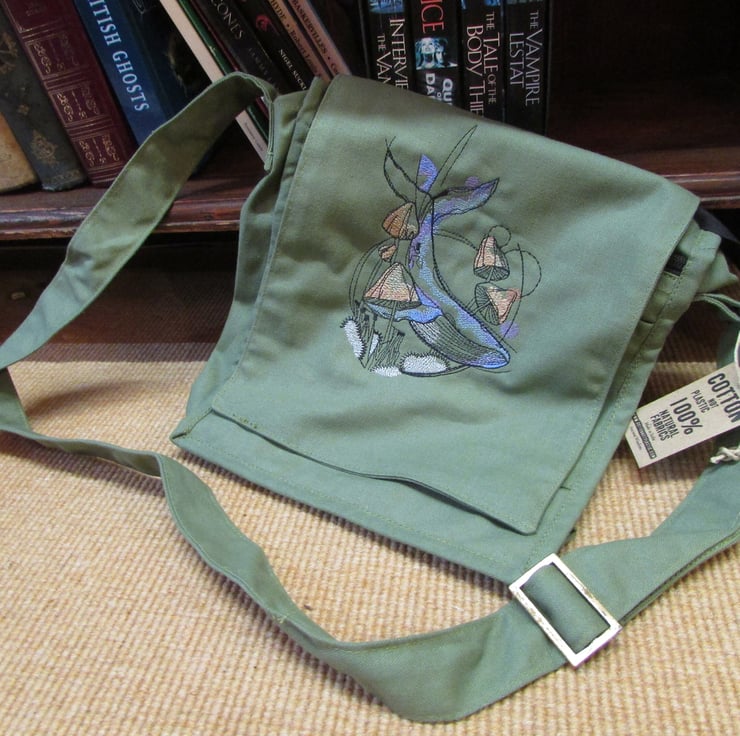 EMBROIDERED 100% COTTON CANVAS MESSENGER BAG WITH WHALE AND MUSHROOM DESIGN