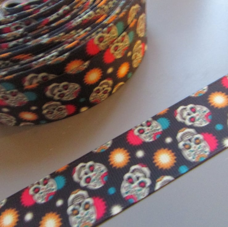 BLACK GOTHIC SUGAR SKULL PATTERNED GROSGRAIN RIBBON SOLD BY THE METRE.