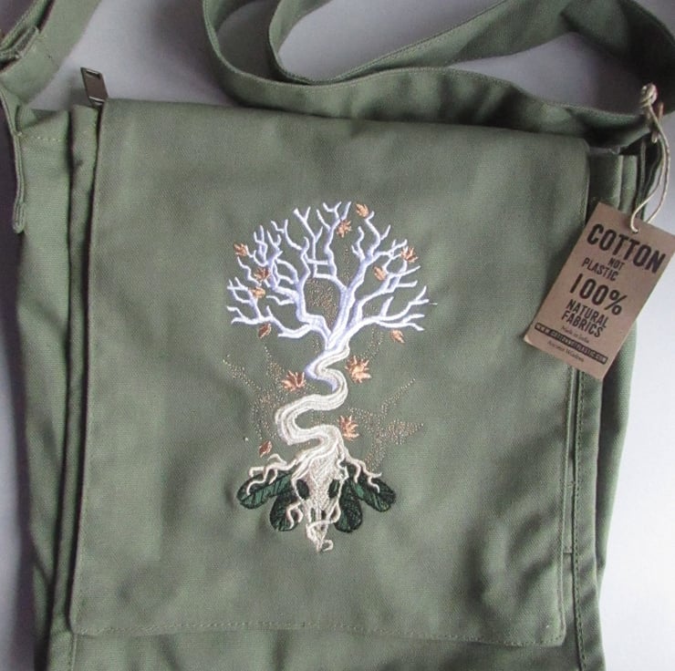 EMBROIDERED 100% COTTON CANVAS MESSENGER BAG WITH TREE & SKULL DESIGN