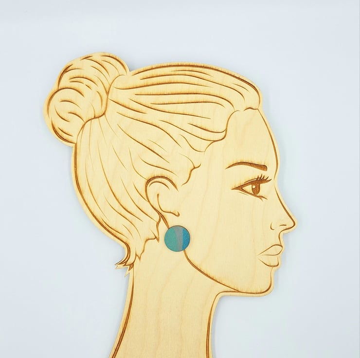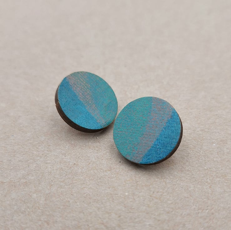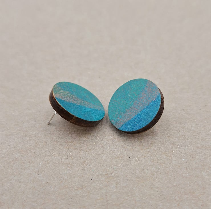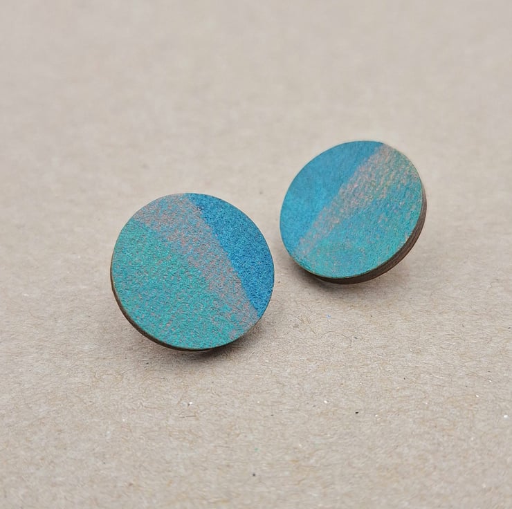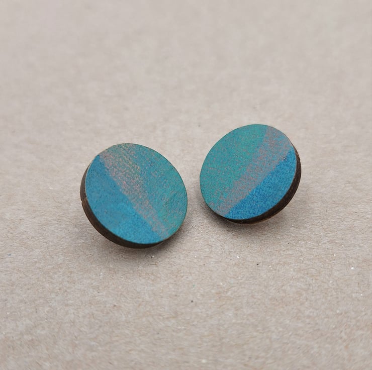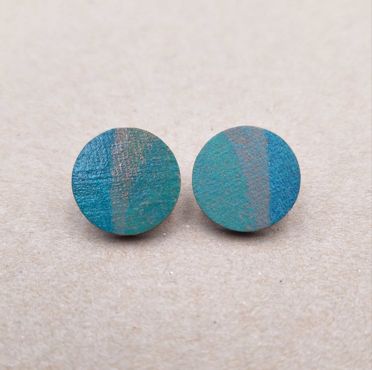 Blue, green and grey hand printed wooden disc stud earrings with 925 sterling silver backs.