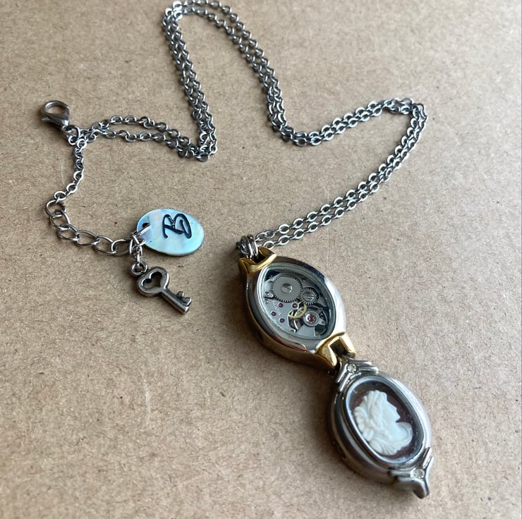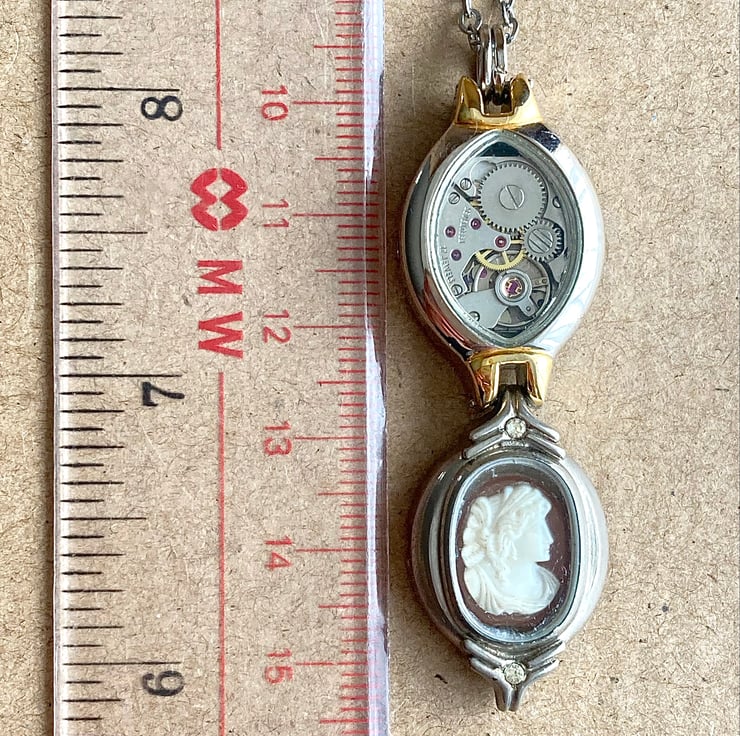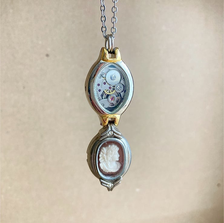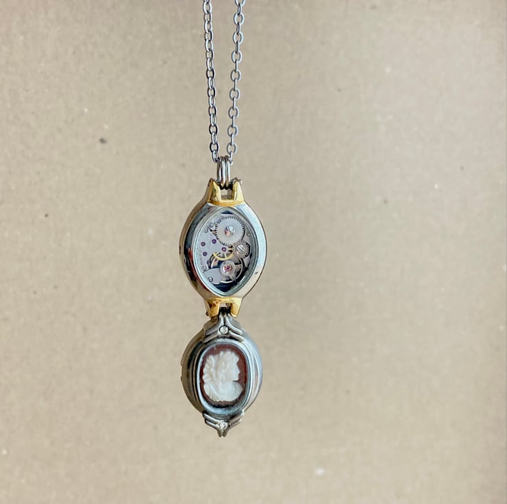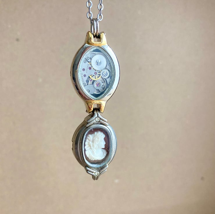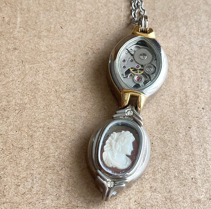 Upcycled Vintage Watch Case And Movement Featured A Vintage Miniature Cameo Necklace - Upcycled steampunk themed necklace