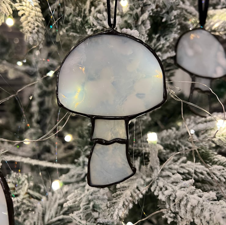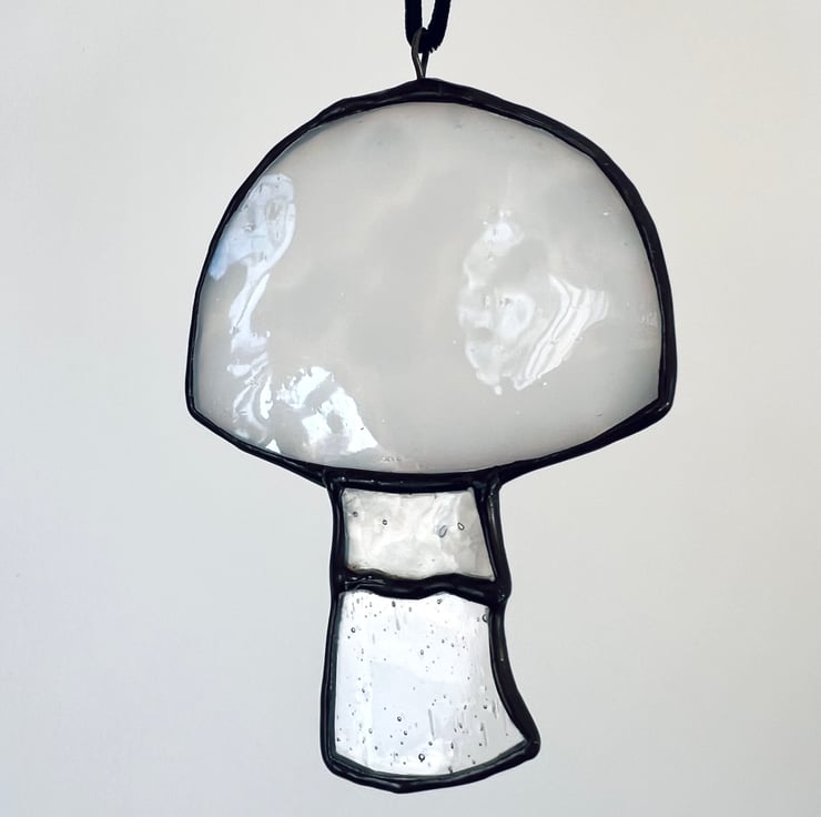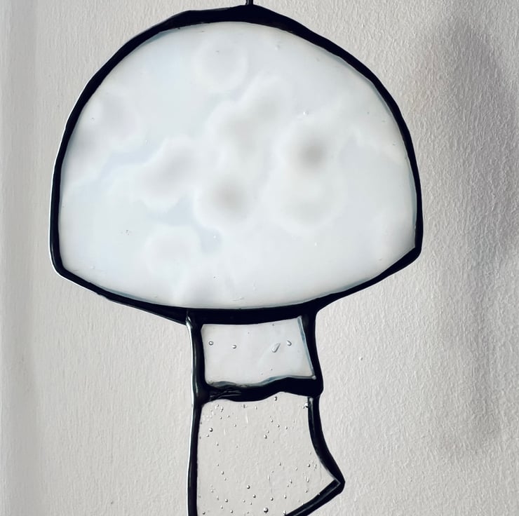 An adorable white mottled stained glass mushroom decoration for year round mushroom loveliness! This little toadstool suncatcher can be hung from windows, door handles - mine hangs from a bookshelf bracket!