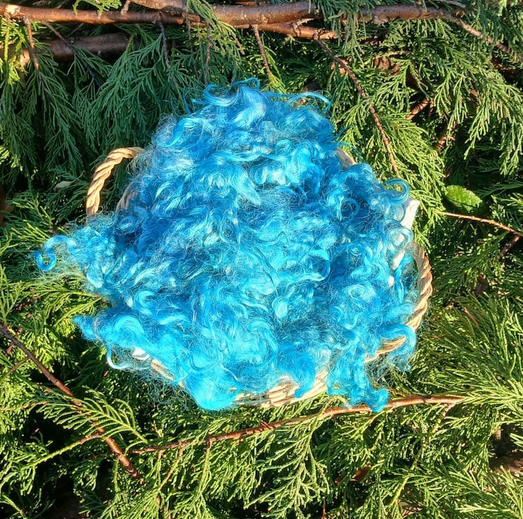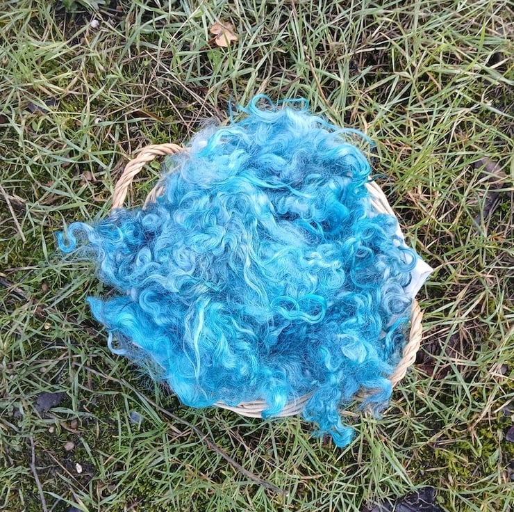 This fleece is from our Autumn shear, it is hand washed. The natural fleece comes in many shades of grey which when overdyed with light blue gives a variety of blue shades. The locks are in soft curls approximately 9cm in length.
